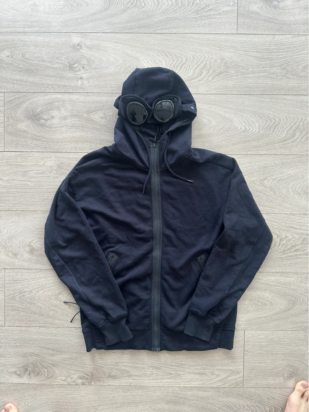 This navy CP Company zip-up hoodie features the brand's signature goggles attached to the hood. It's made from a comfortable cotton blend. Zipper closure with front pockets. Great for layering or on its own!