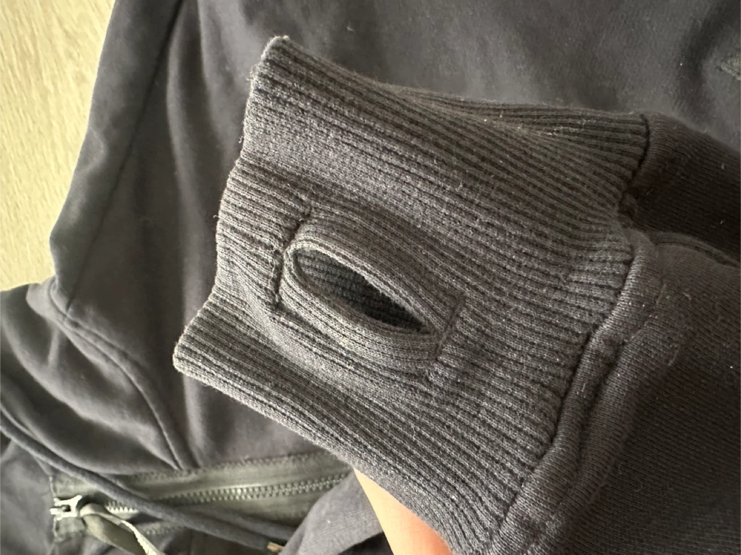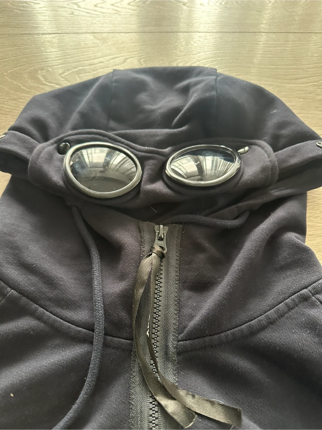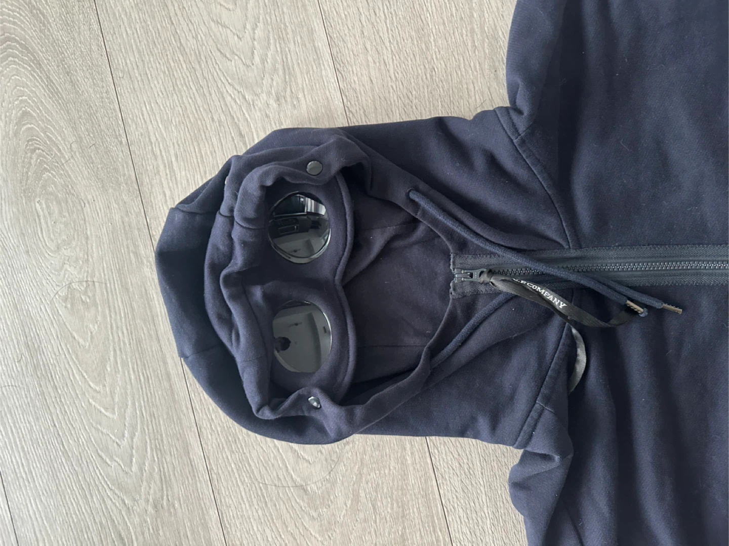 This navy CP Company zip-up hoodie features the brand's signature goggles attached to the hood. It's made from a comfortable cotton blend. Zipper closure with front pockets. Great for layering or on its own!