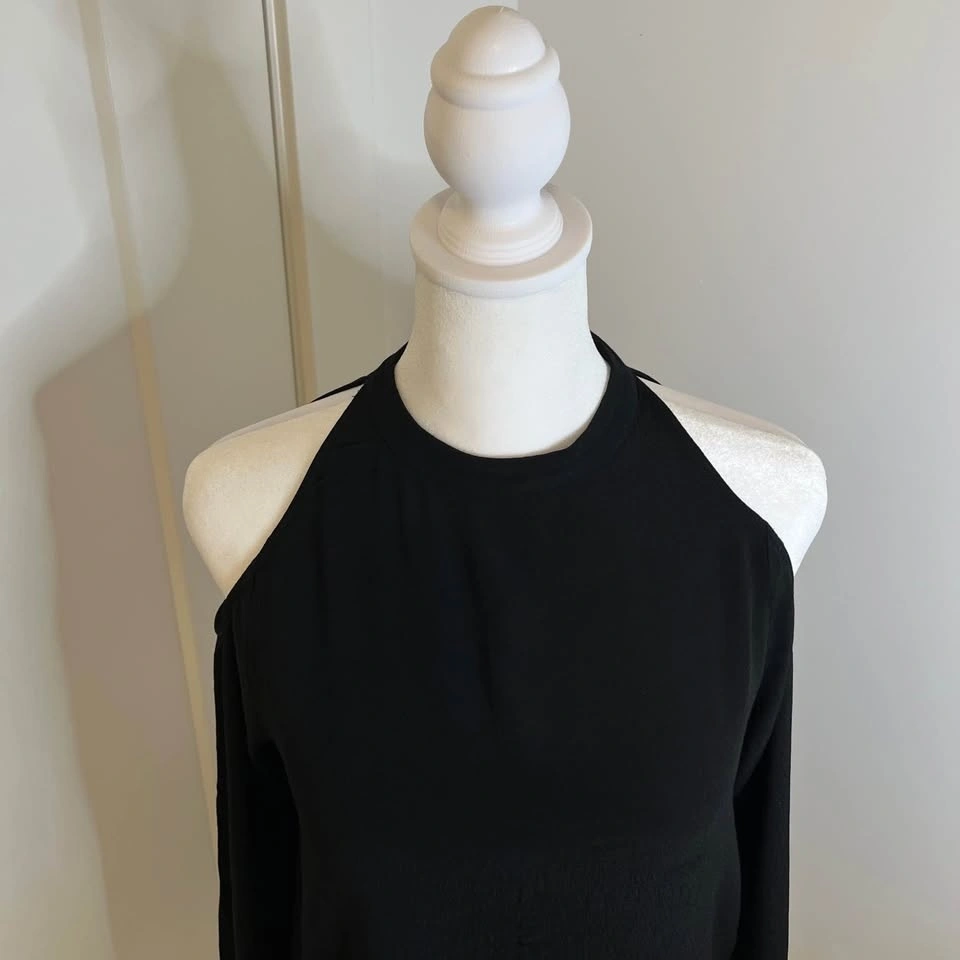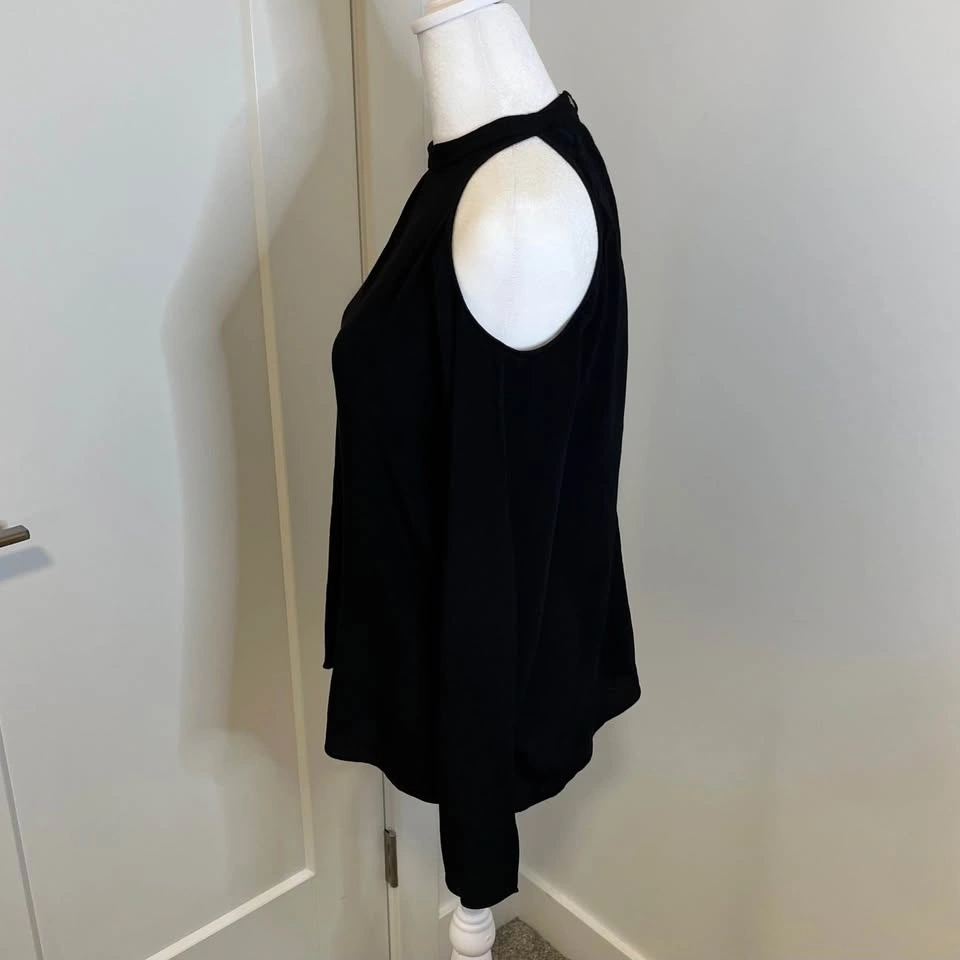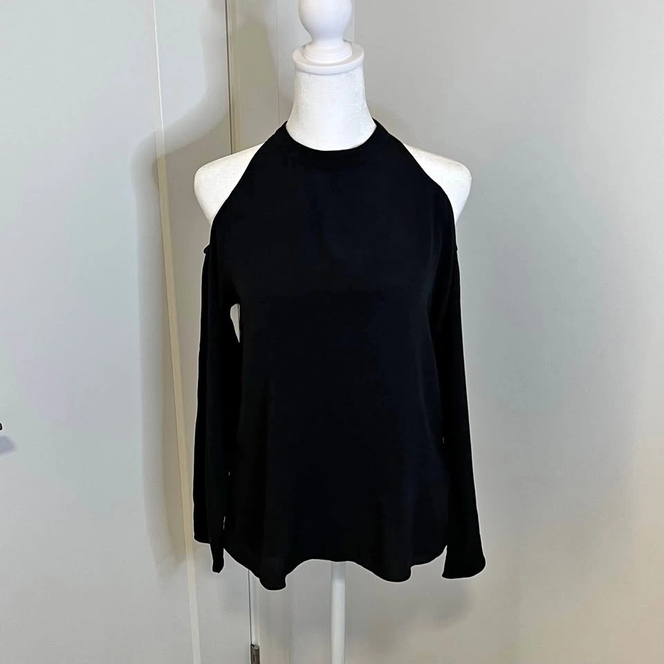 Wilfred Free black blouse from Aritzia. Long sleeves with open shoulder cutouts. Cutout at the top back. Closes with clasp snap. High collar. Made from lightweight 100% Ryon material. Size S.