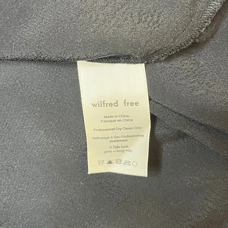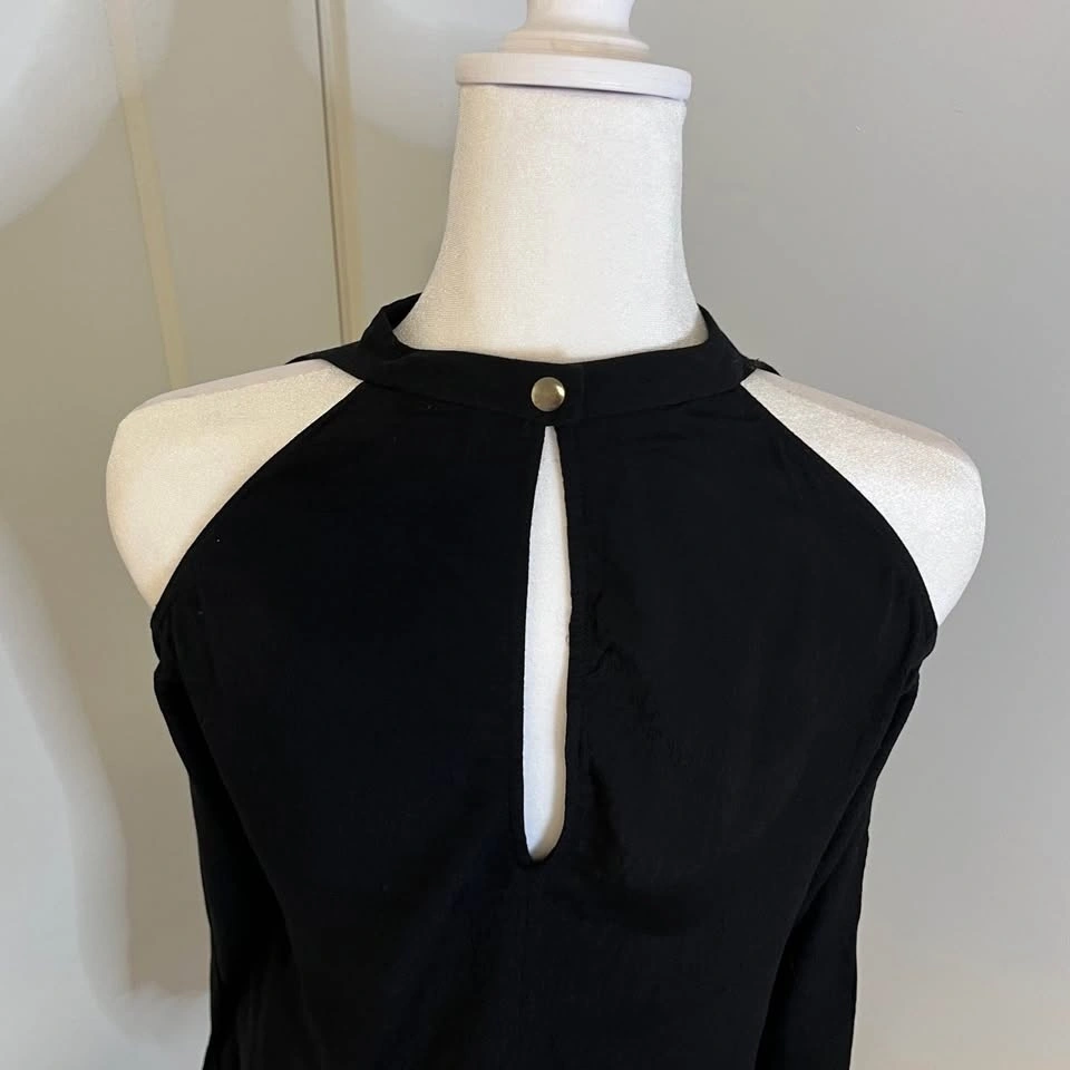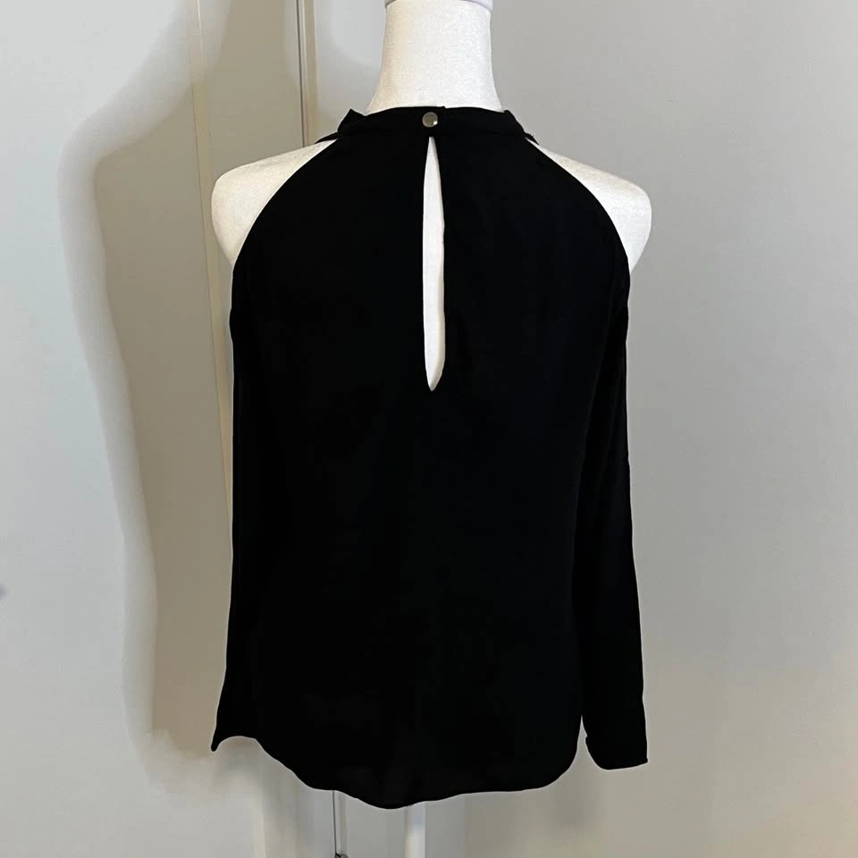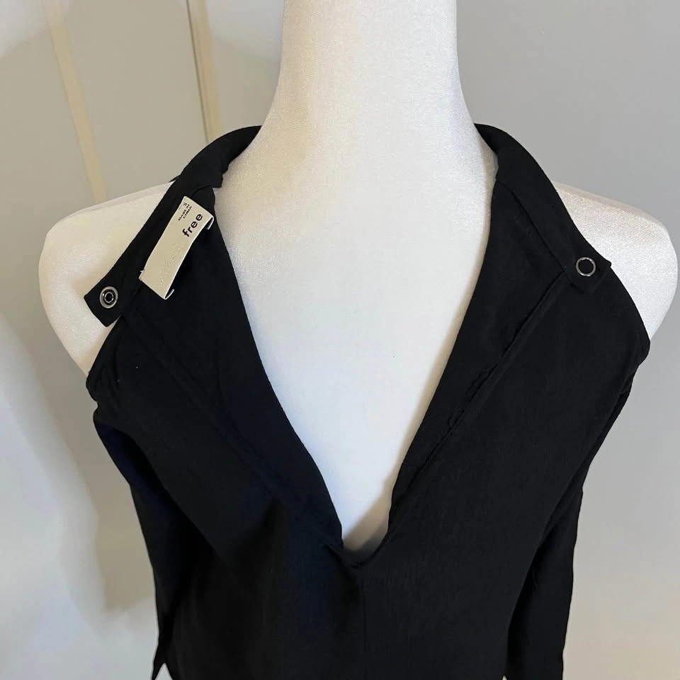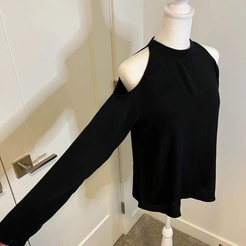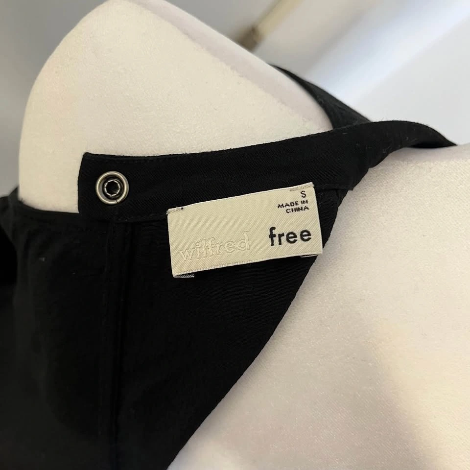 Wilfred Free black blouse from Aritzia. Long sleeves with open shoulder cutouts. Cutout at the top back. Closes with clasp snap. High collar. Made from lightweight 100% Ryon material. Size S.