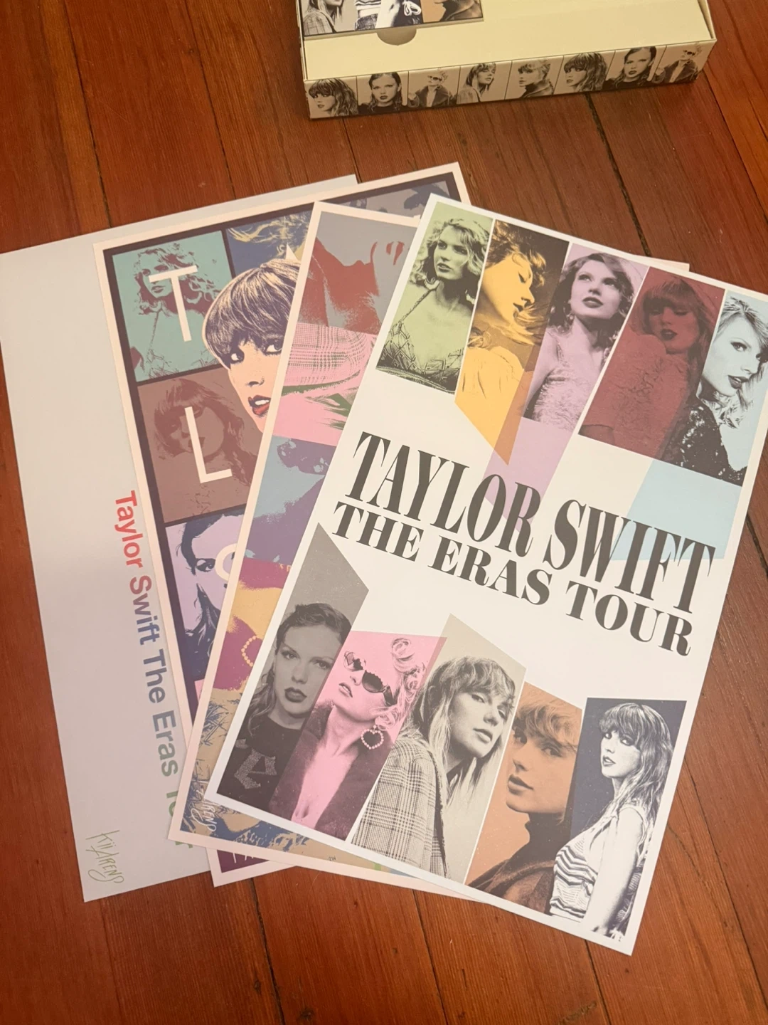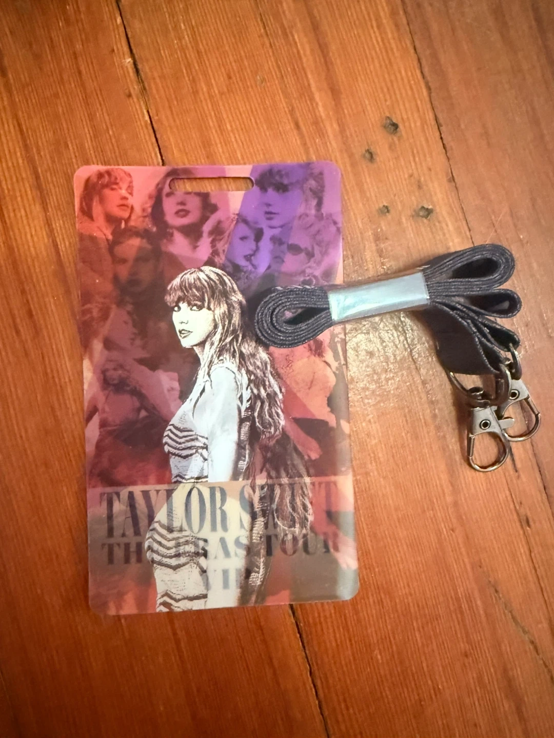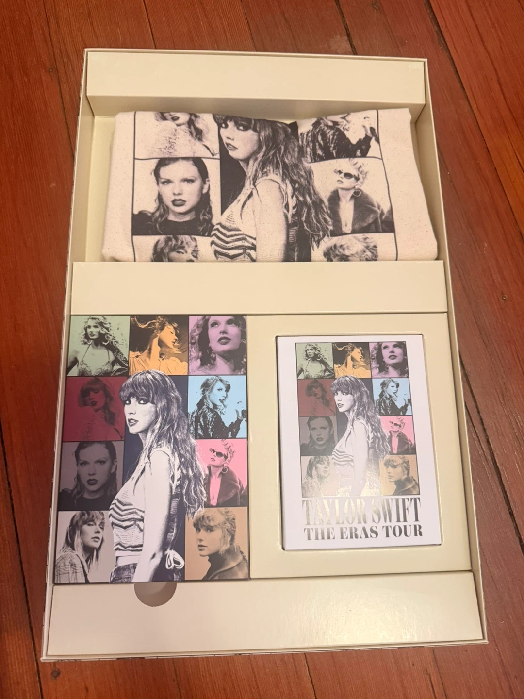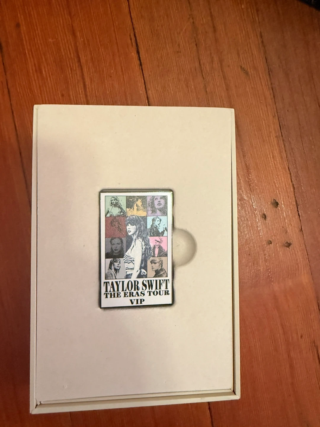 This is my Taylor Swift The Eras Tour VIP package. It includes a lanyard with a pass, a reusable bag, a pin, and an envelope of various prints. Nothing in this box has been used, and I honestly don’t think I had taken anything out of the packaging until I took photos. Everything is pristine condition.