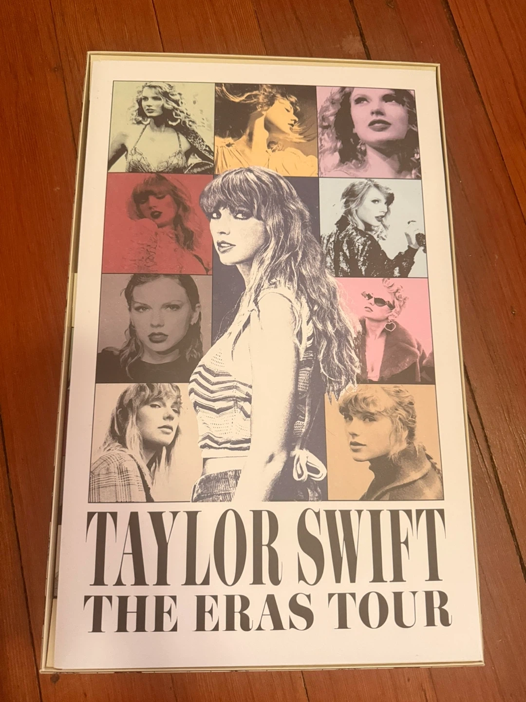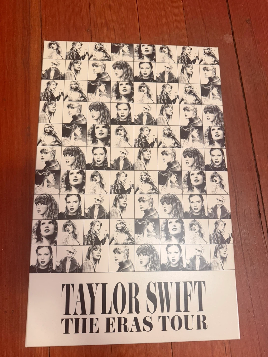 This is my Taylor Swift The Eras Tour VIP package. It includes a lanyard with a pass, a reusable bag, a pin, and an envelope of various prints. Nothing in this box has been used, and I honestly don’t think I had taken anything out of the packaging until I took photos. Everything is pristine condition.