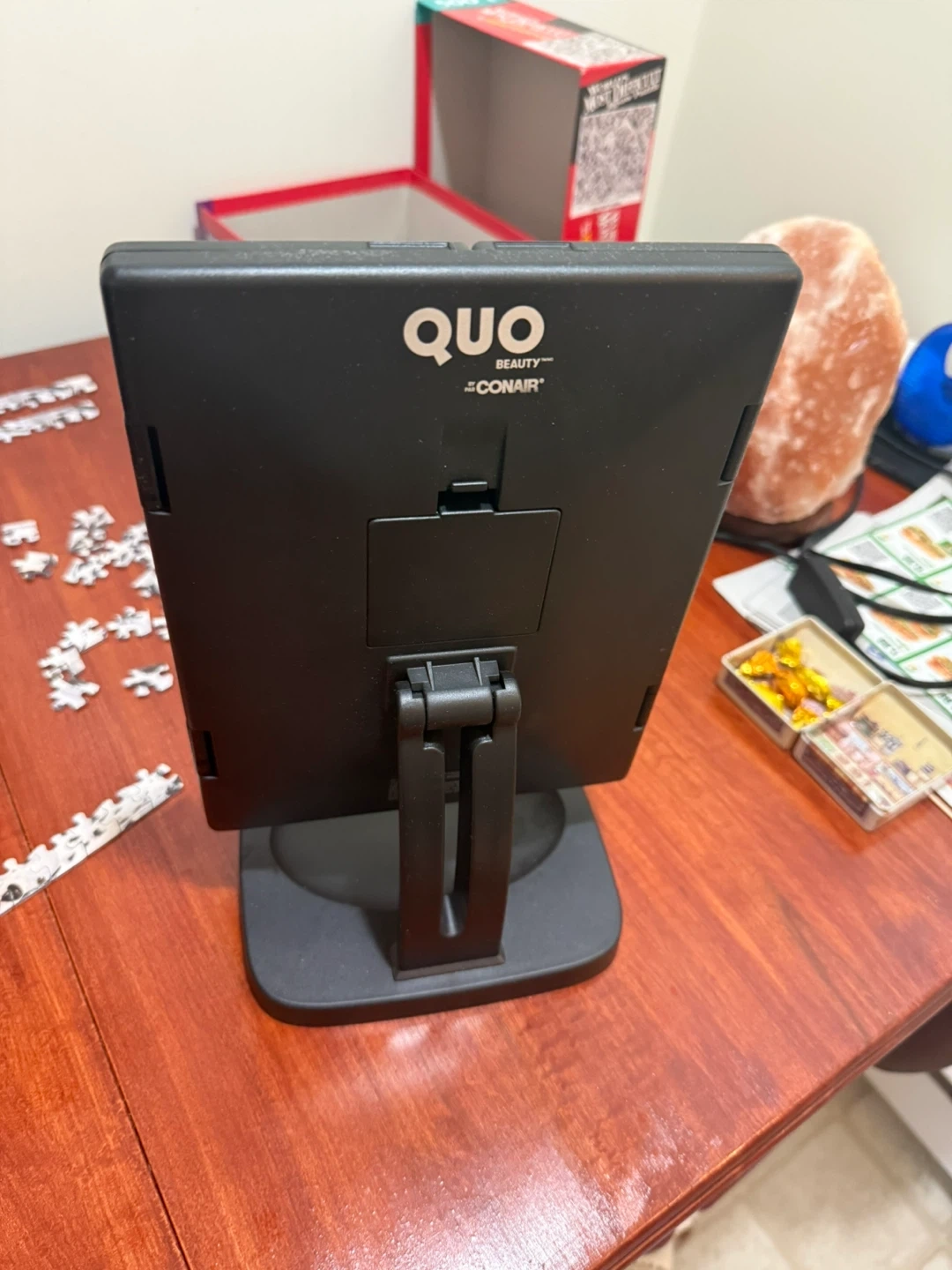 This QUO Beauty tri-fold mirror offers 1x and 3x magnification for detailed tasks. It's equipped with LED lighting with three different brightness settings. A great mirror for makeup application or grooming!Comes with brand new batteries as still like new .