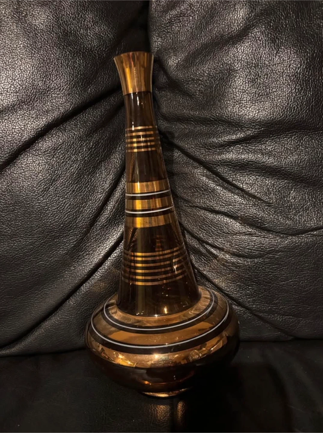 This vase is made of amber-coloured glass. It features decorative gold and white stripes around its body and neck. Its unique shape makes it a stylish decorative piece.