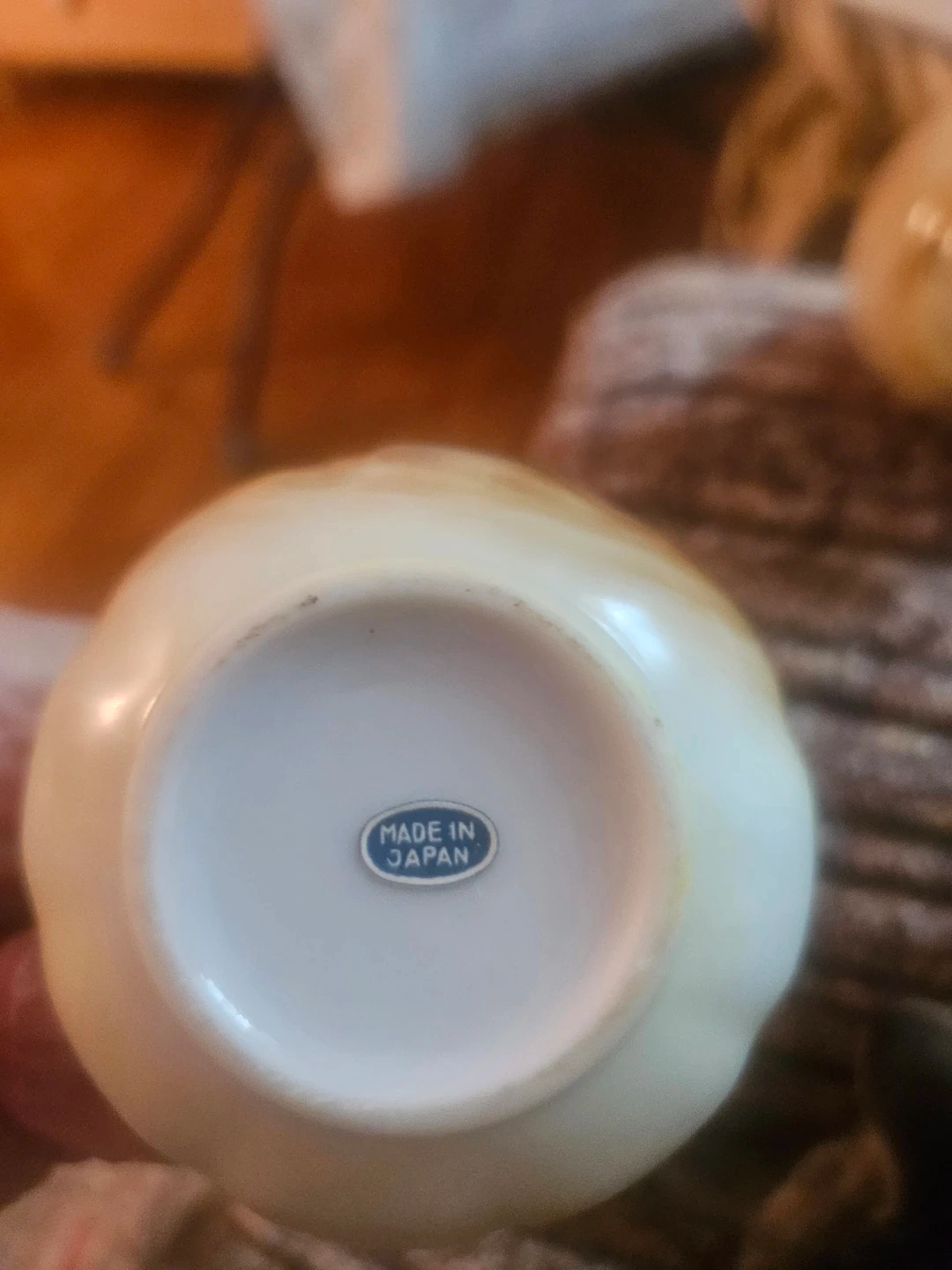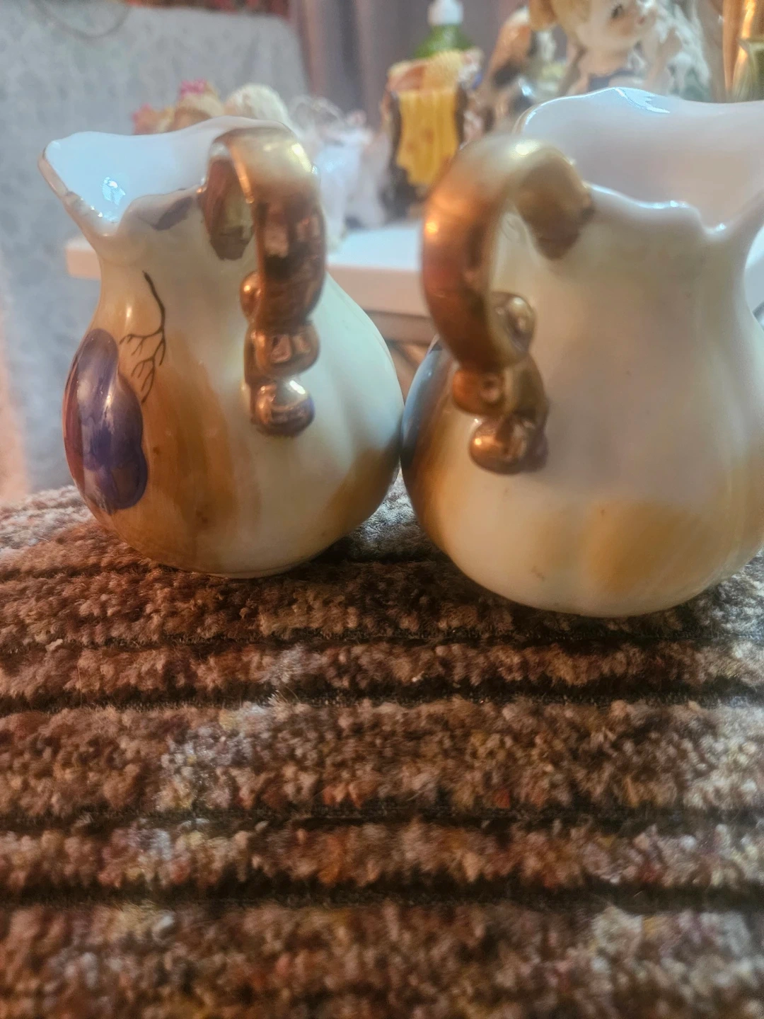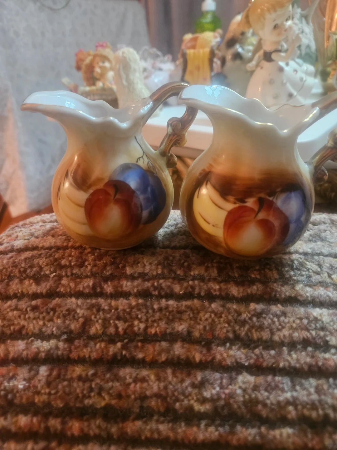 This is a set of two miniature ceramic creamers. They feature a delicate fruit design with gold-tone handles. Made in Japan.