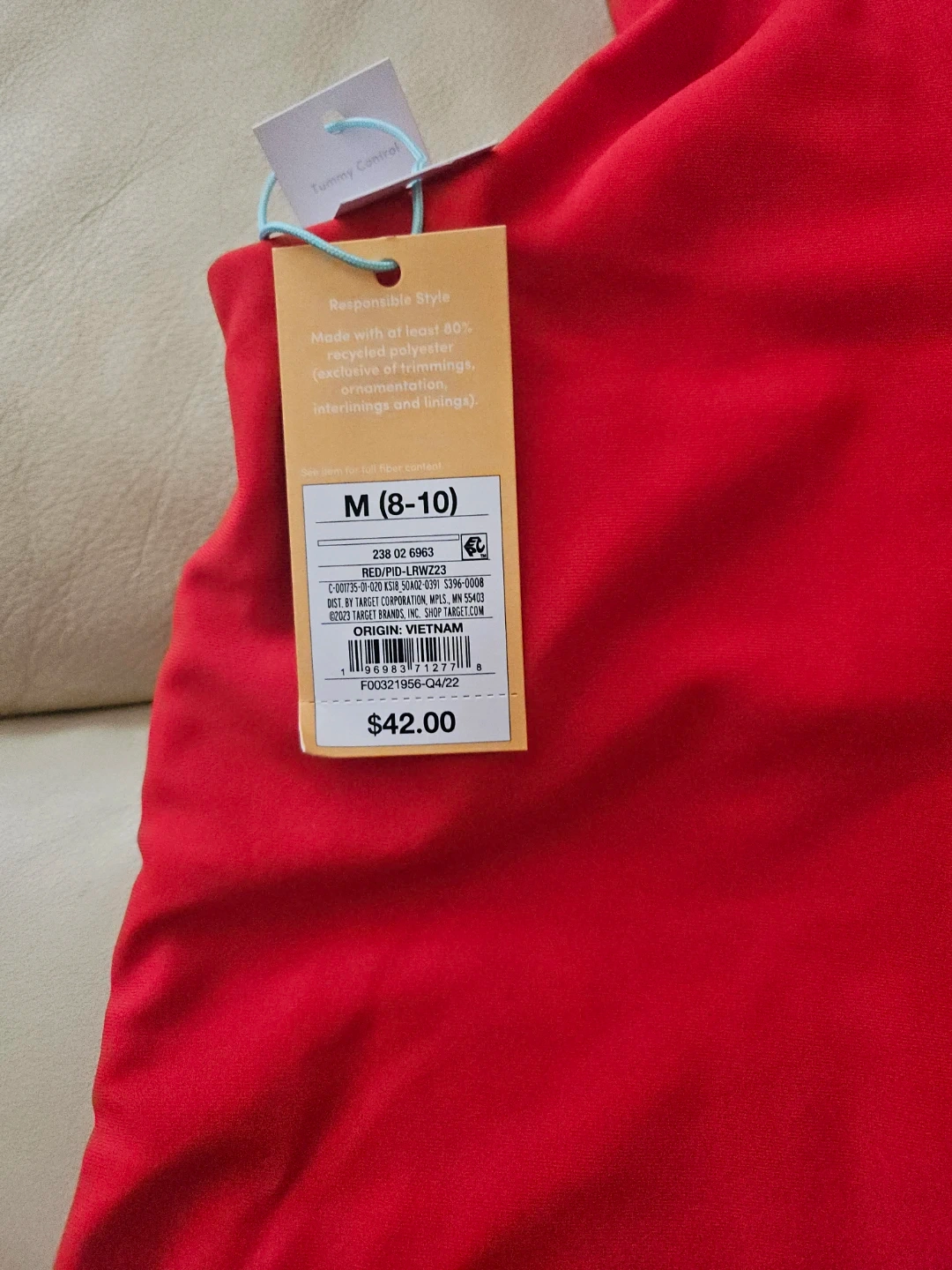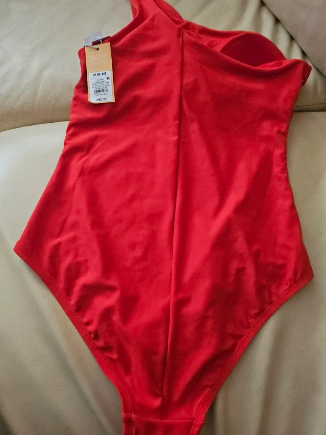 This is a red, one-shoulder one-piece swimsuit. It's size M (8-10). Made with at least 80% recycled polyester..