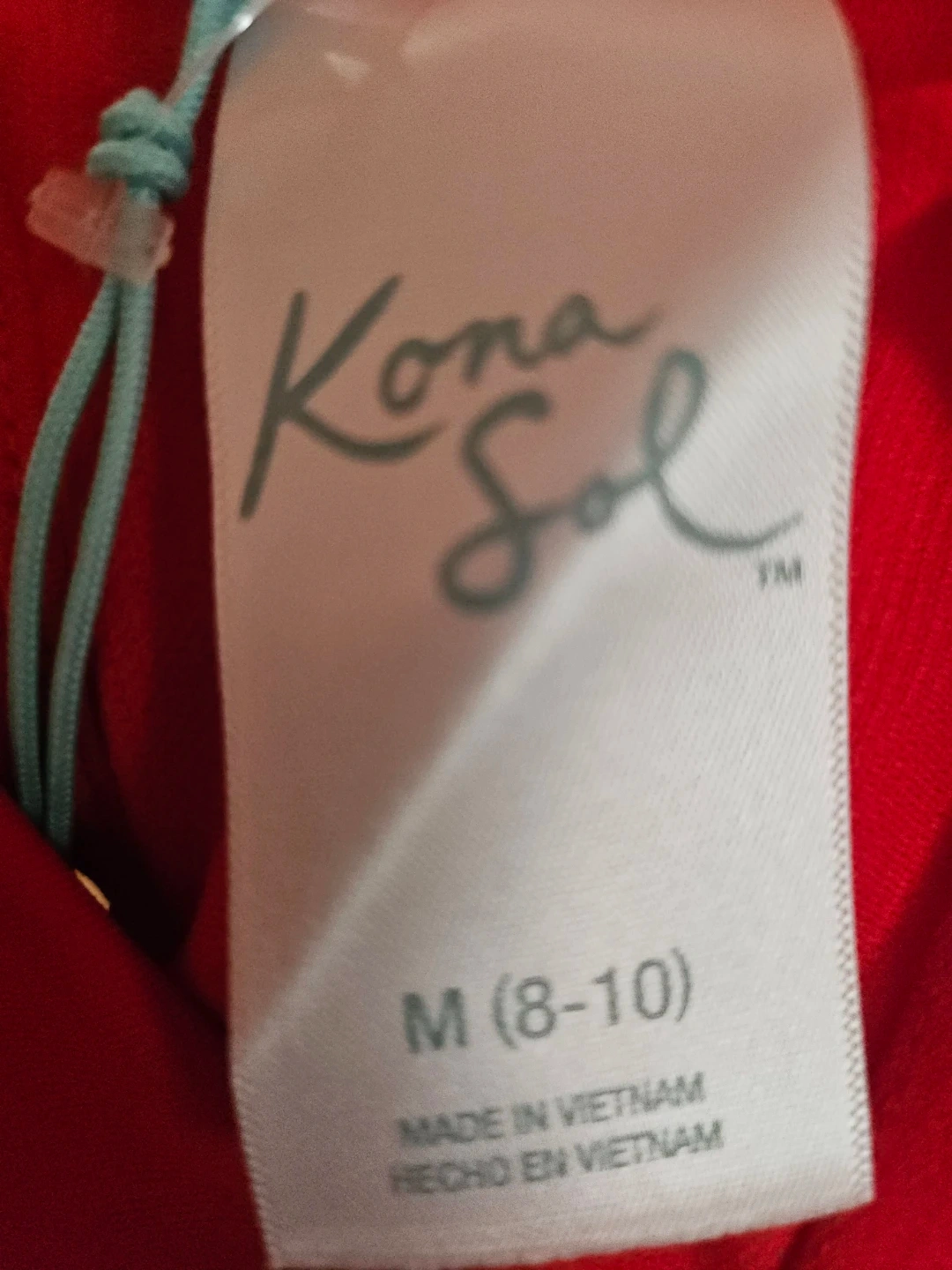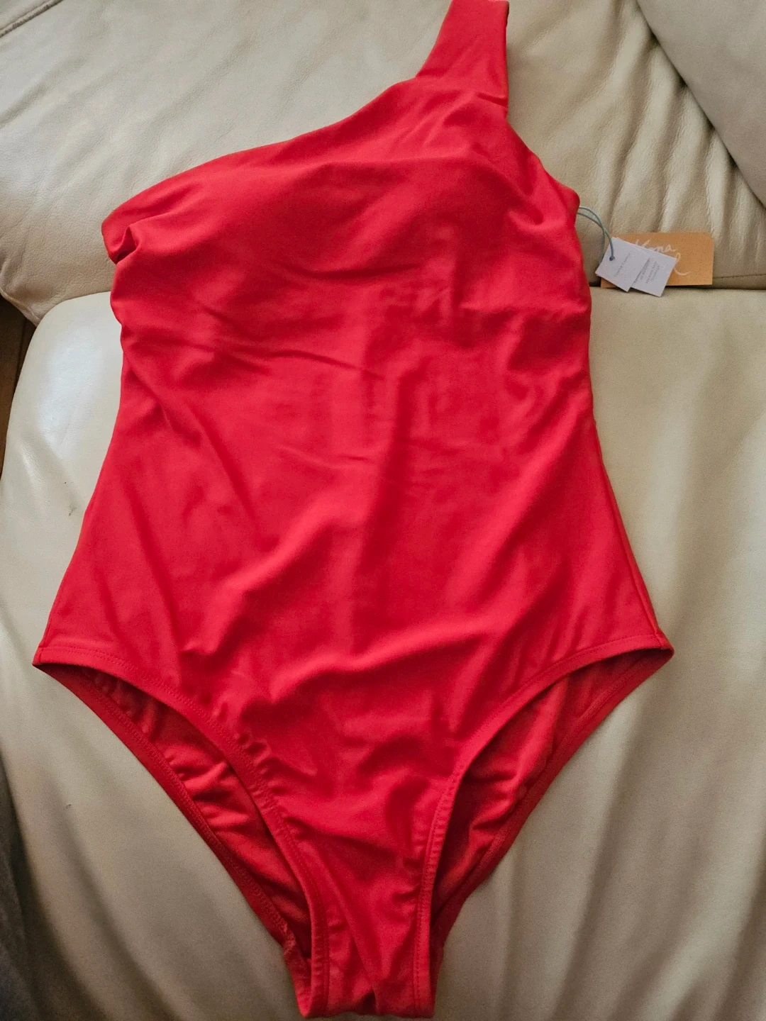 This is a red, one-shoulder one-piece swimsuit. It's size M (8-10). Made with at least 80% recycled polyester..