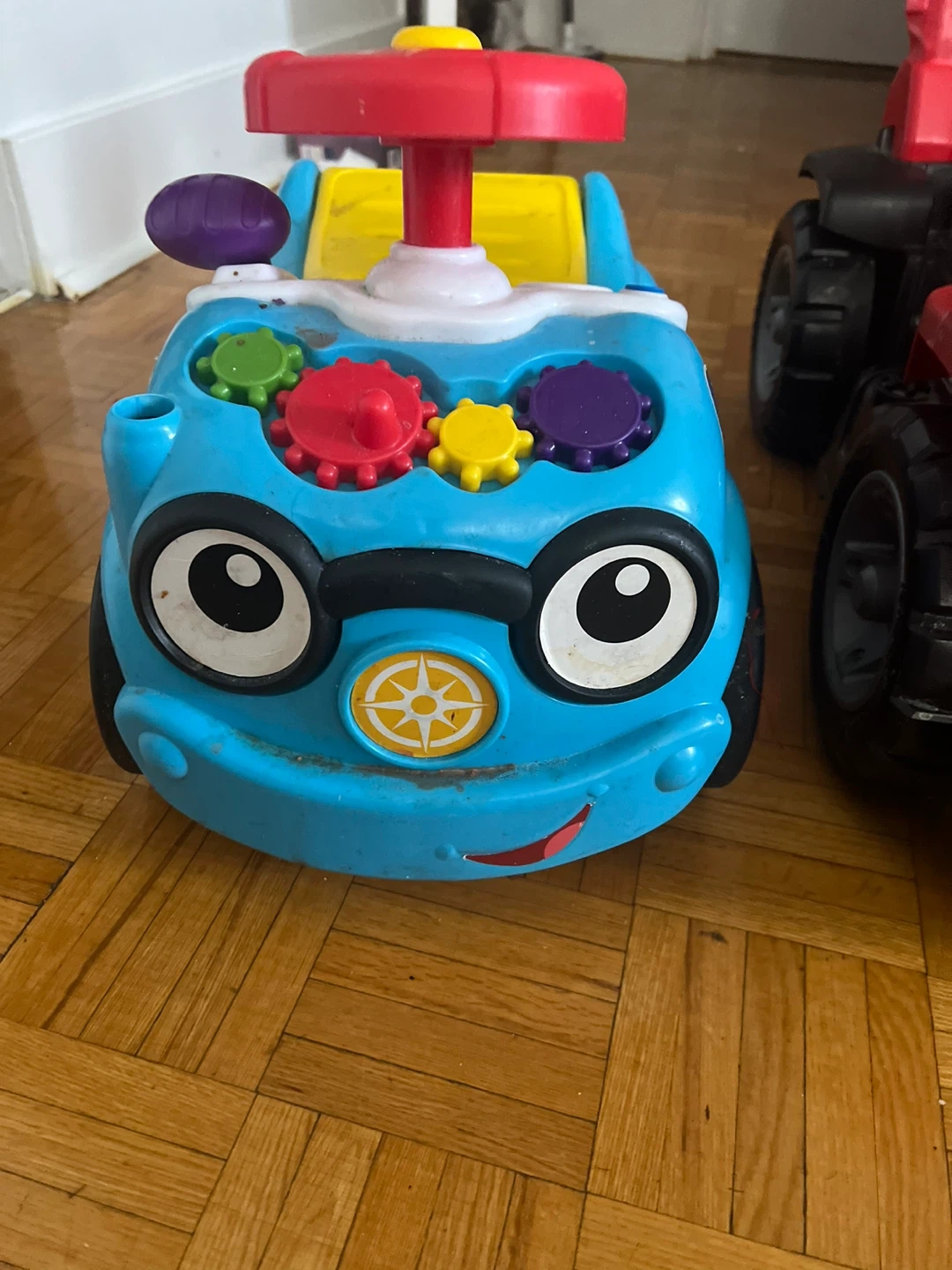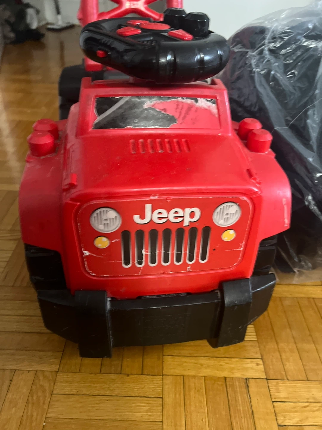 Red Jeep ride-on toy car with steering wheel and buttons. Also includes a blue ride-on toy car with gears and steering wheel. Plastic construction. It's a fun toy for toddlers!