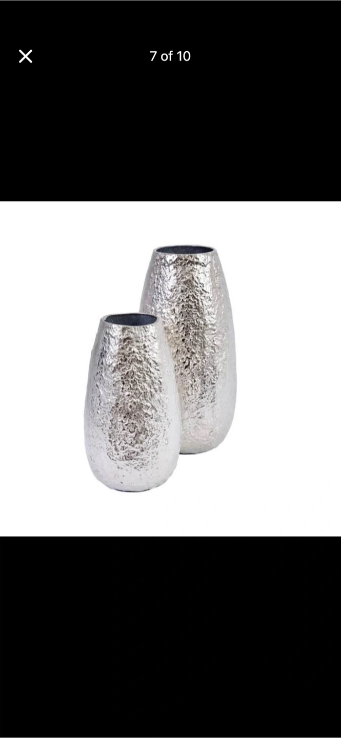 decorative vases with a textured silver finish. They're great for adding a touch of modern style to any room. The larger vase is taller and wider than the smaller one.