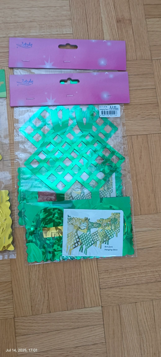 Here's a set of decorations for eid! It includes various green and gold decorative pieces, still in their original packaging