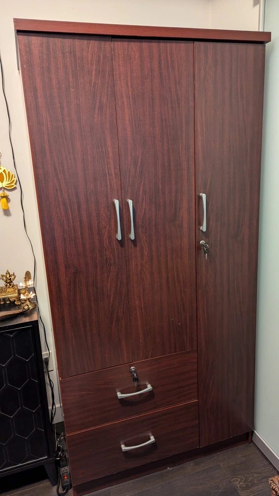 Brown wooden armoire with three doors, two drawers, and silver hardware.