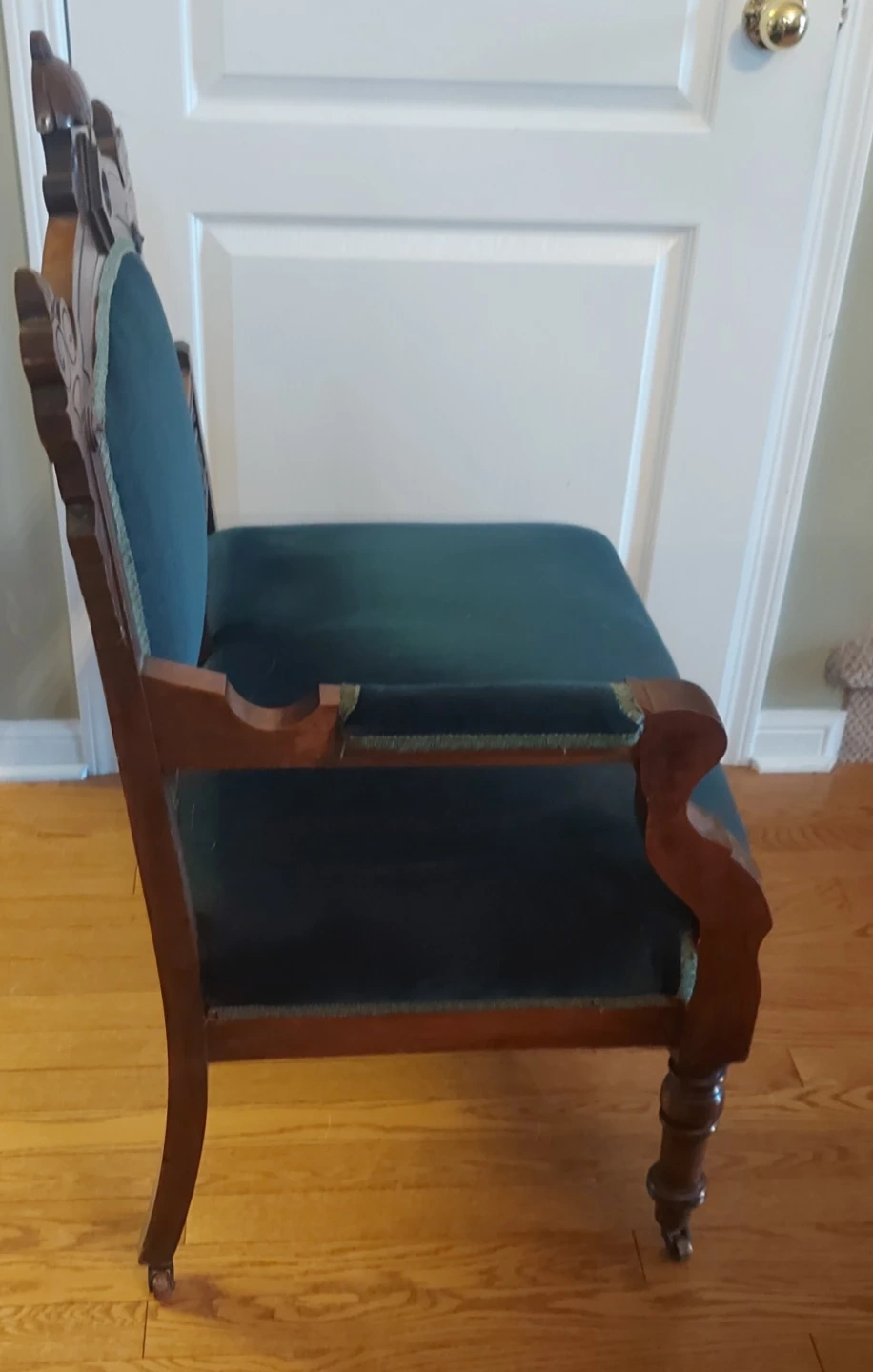 This is a beautifully crafted antique accent chair. It's made of dark wood with green velvet upholstery. The chair features ornate carvings and decorative trim. Great for adding a vintage touch to any room!
