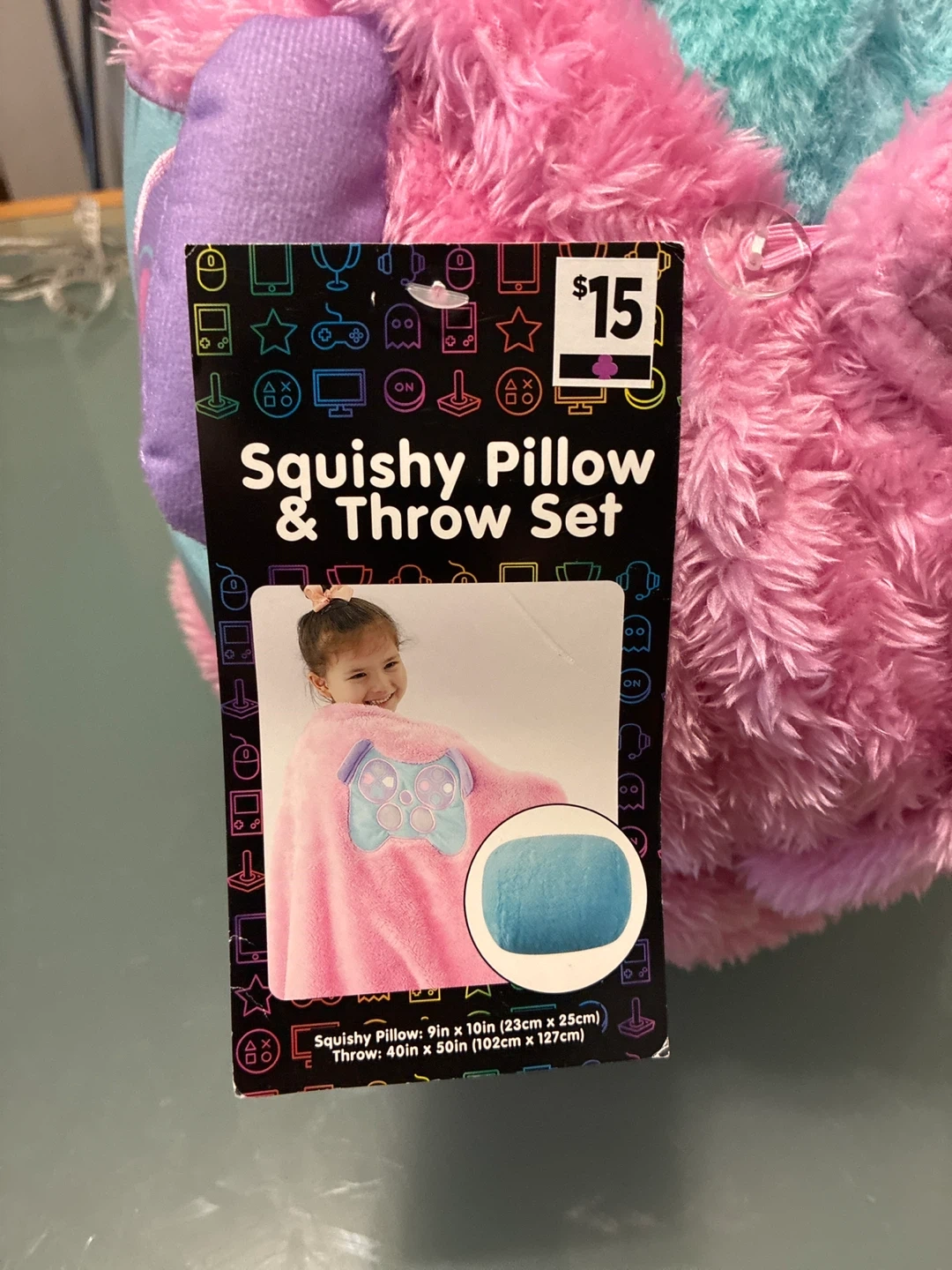 This squishy pillow and throw set features a fun video game controller design. The pillow measures 9in x 10in (23cm x 25cm) and the throw measures 40in x 50in (102cm x 127cm). It's a cozy and playful addition to any room!