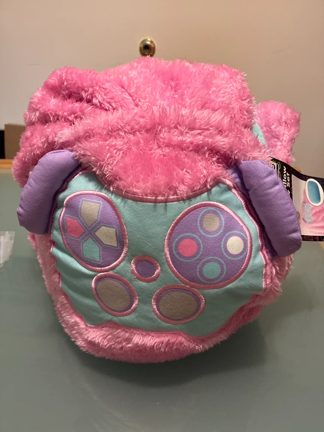This squishy pillow and throw set features a fun video game controller design. The pillow measures 9in x 10in (23cm x 25cm) and the throw measures 40in x 50in (102cm x 127cm). It's a cozy and playful addition to any room!