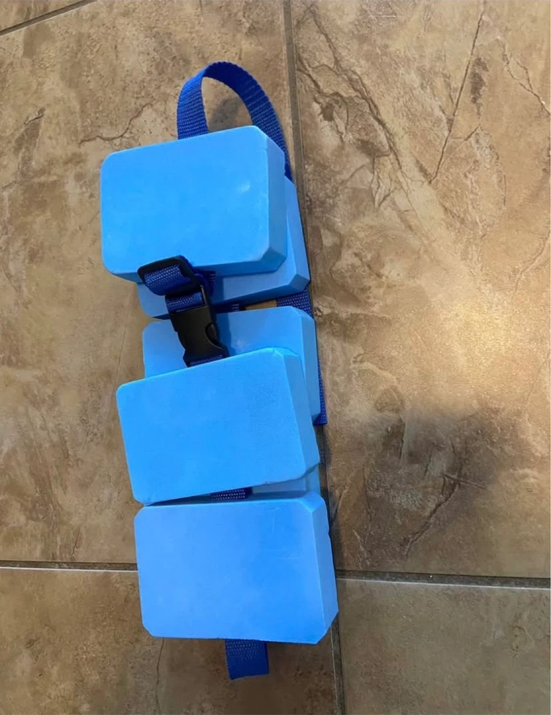This blue foam swim belt is designed to help children learn to swim. It features adjustable straps and a secure buckle for a snug fit. The foam construction provides buoyancy for water safety.