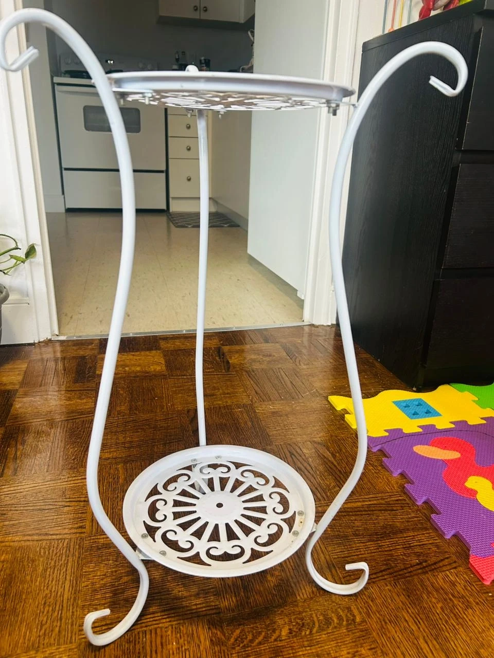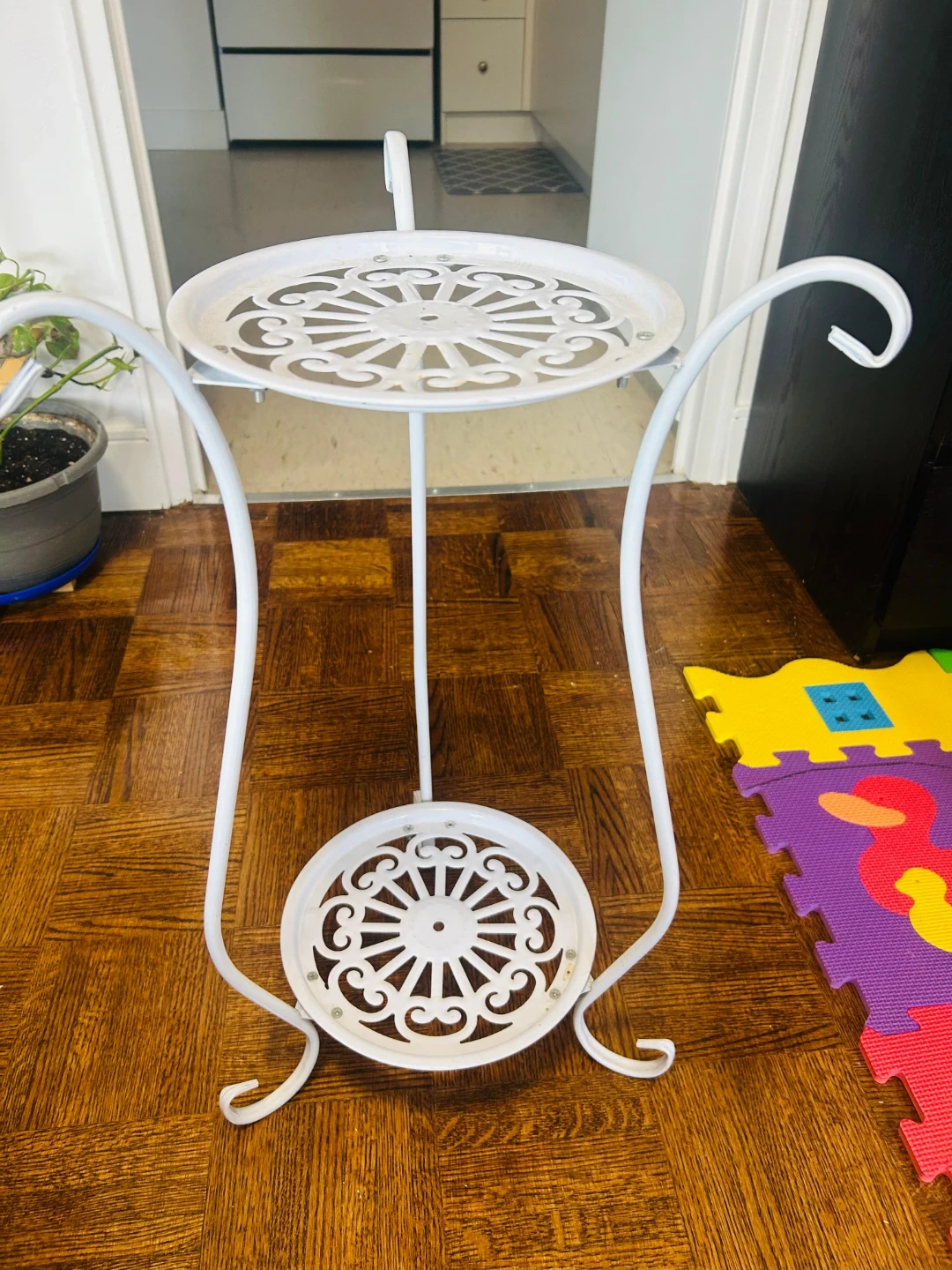 This white metal tiered plant stand has two decorative shelves. It's perfect for showcasing your favourite plants indoors or out! The ornate scrollwork adds a touch of elegance to any space.