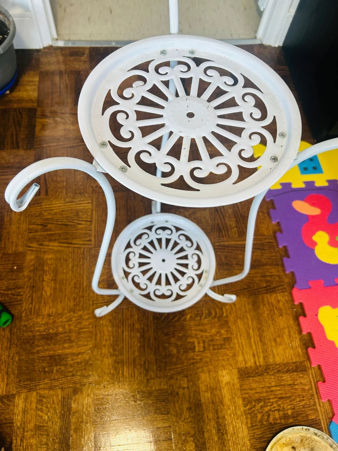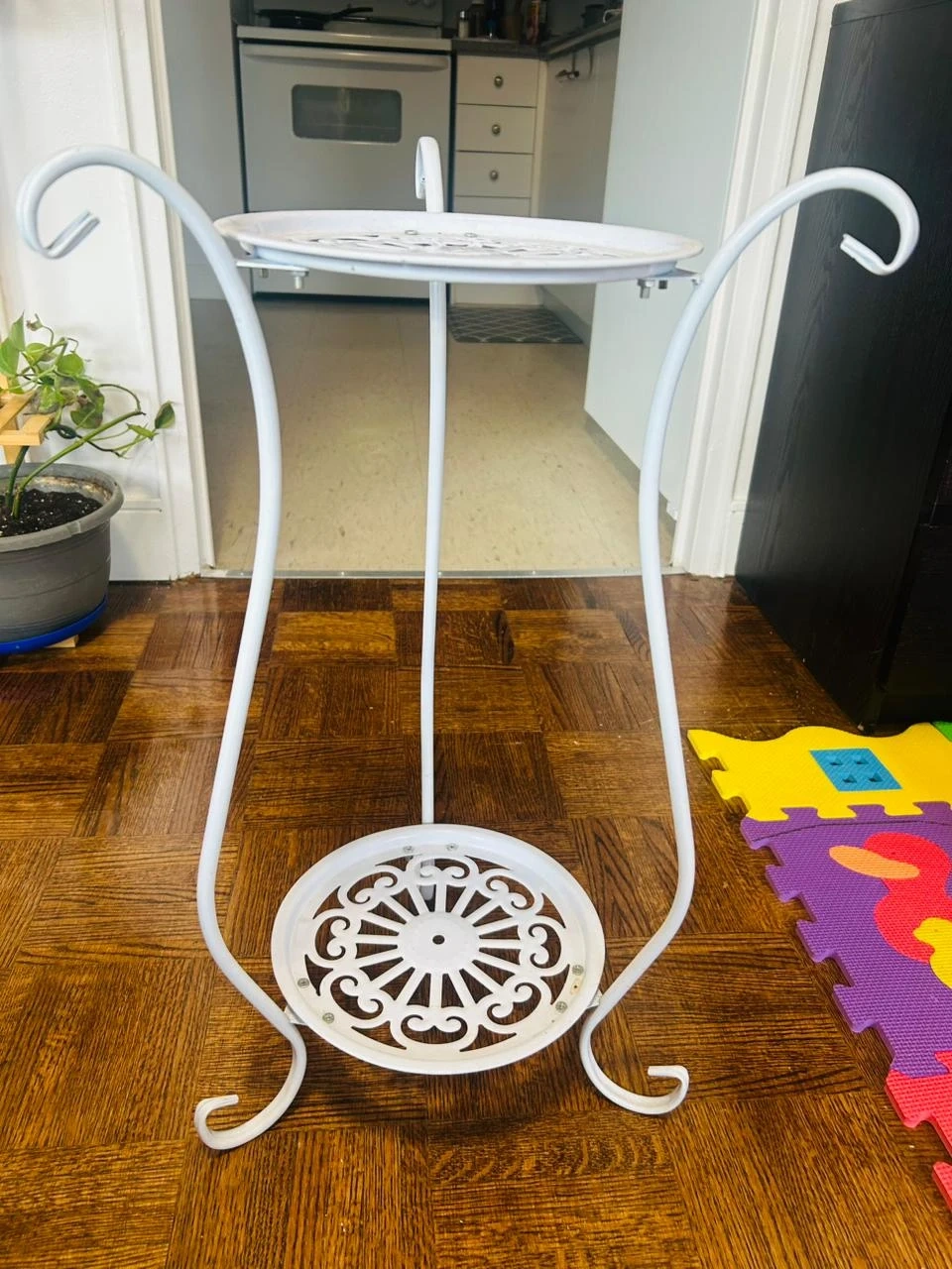 This white metal tiered plant stand has two decorative shelves. It's perfect for showcasing your favourite plants indoors or out! The ornate scrollwork adds a touch of elegance to any space.