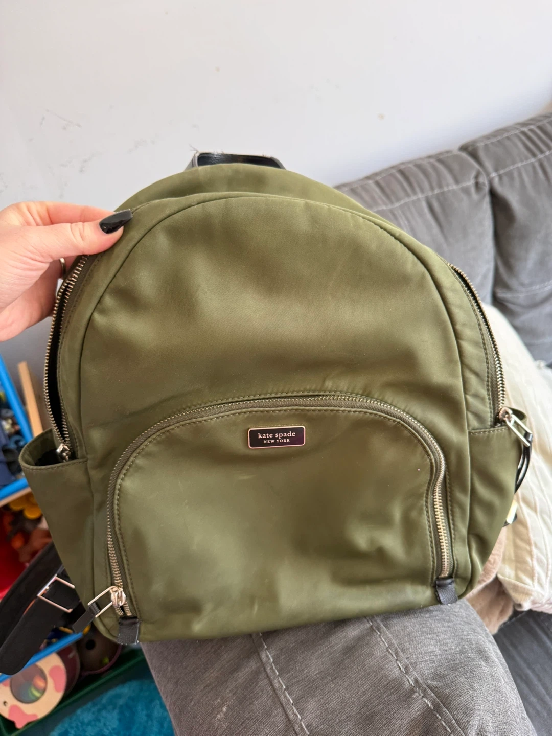 A practical Kate Spade New York backpack in a nice olive green colour. It's made from a durable nylon material and features multiple zippered pockets for organization. This versatile backpack is great for everyday use!