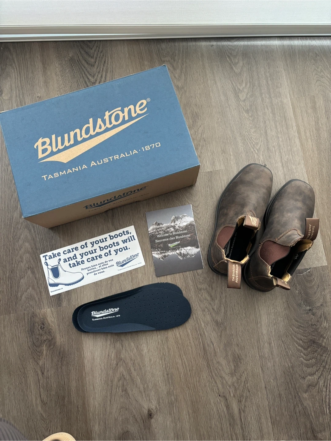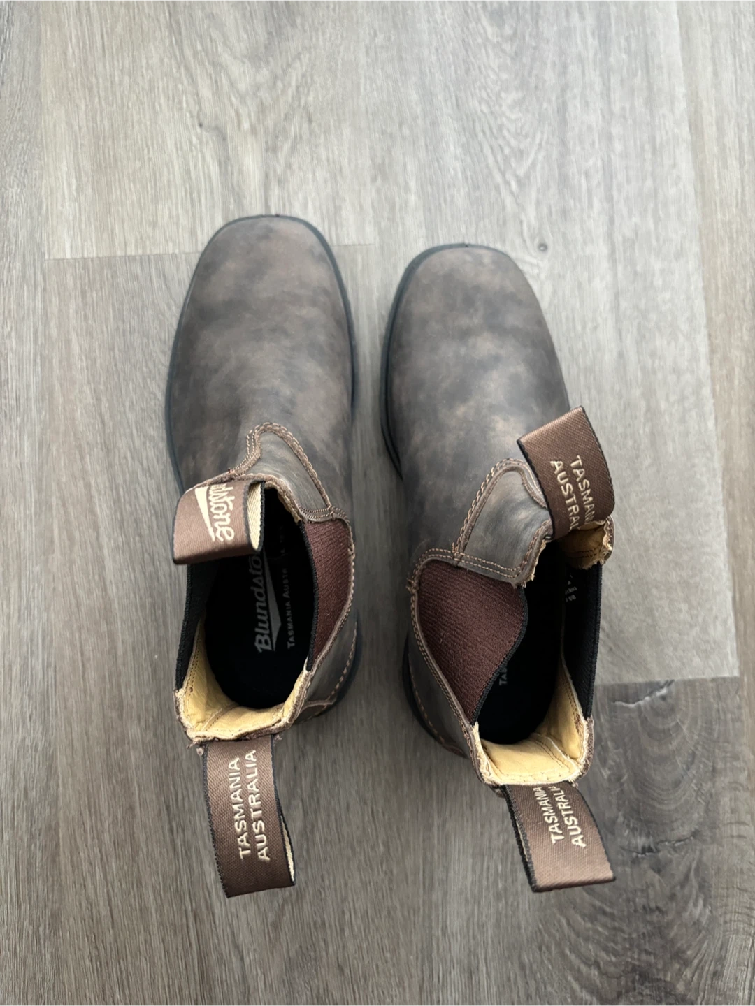 Brand new pair of Blundstone boots. Style 1306, rustic brown in size 3.5AU/6.5US. Includes original box, care card, and second pair of insoles. These are classic pull-on boots with elastic side panels and pulls. Great for everyday wear.
