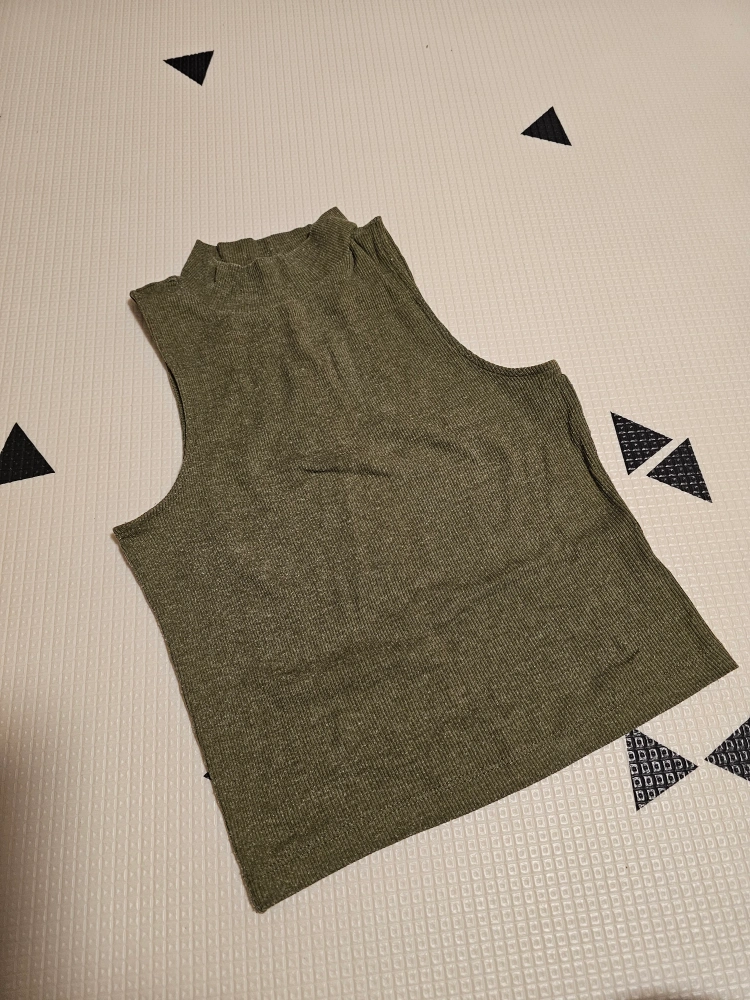 Women's olive green sleeveless cropped top. Mock neck design. Ribbed fabric. Great for layering or wearing on its own.
