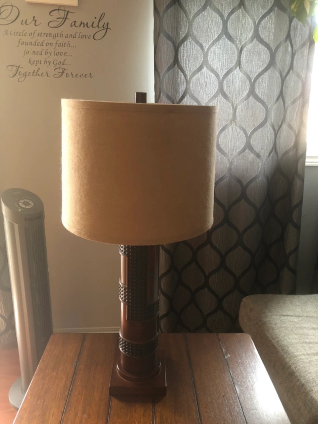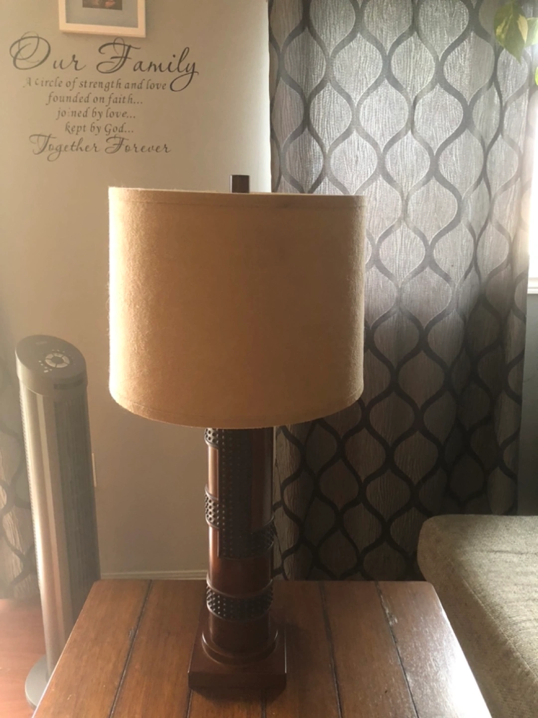 Table lamp with a brown base and a beige fabric shade. The base has a textured design. Includes a lightbulb.