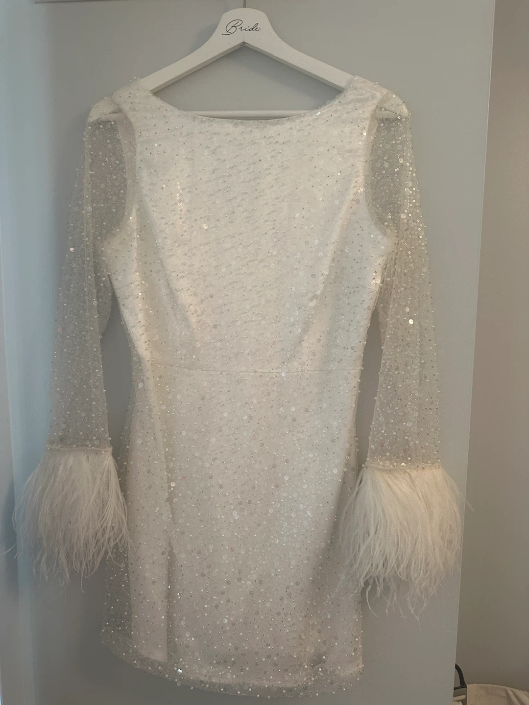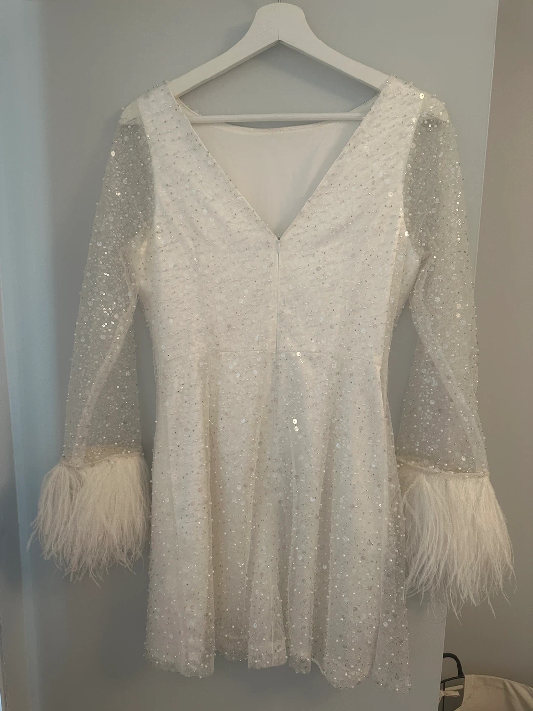 Selling a beautiful DESIGN sequin mini dress! It's a size 6 and features long sleeves with feather trim. Perfect for a party or special occasion!
