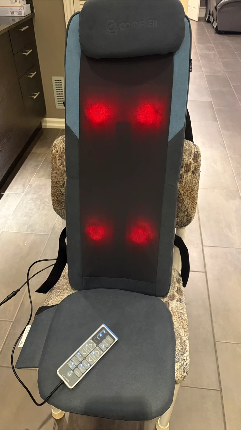 This Comfier massage seat cushion offers a full back massage with heat. It includes a remote for customized settings. The cushion is 31.5 inches long and weighs 8.38 lbs. It's great for relieving muscle tension after a long day.