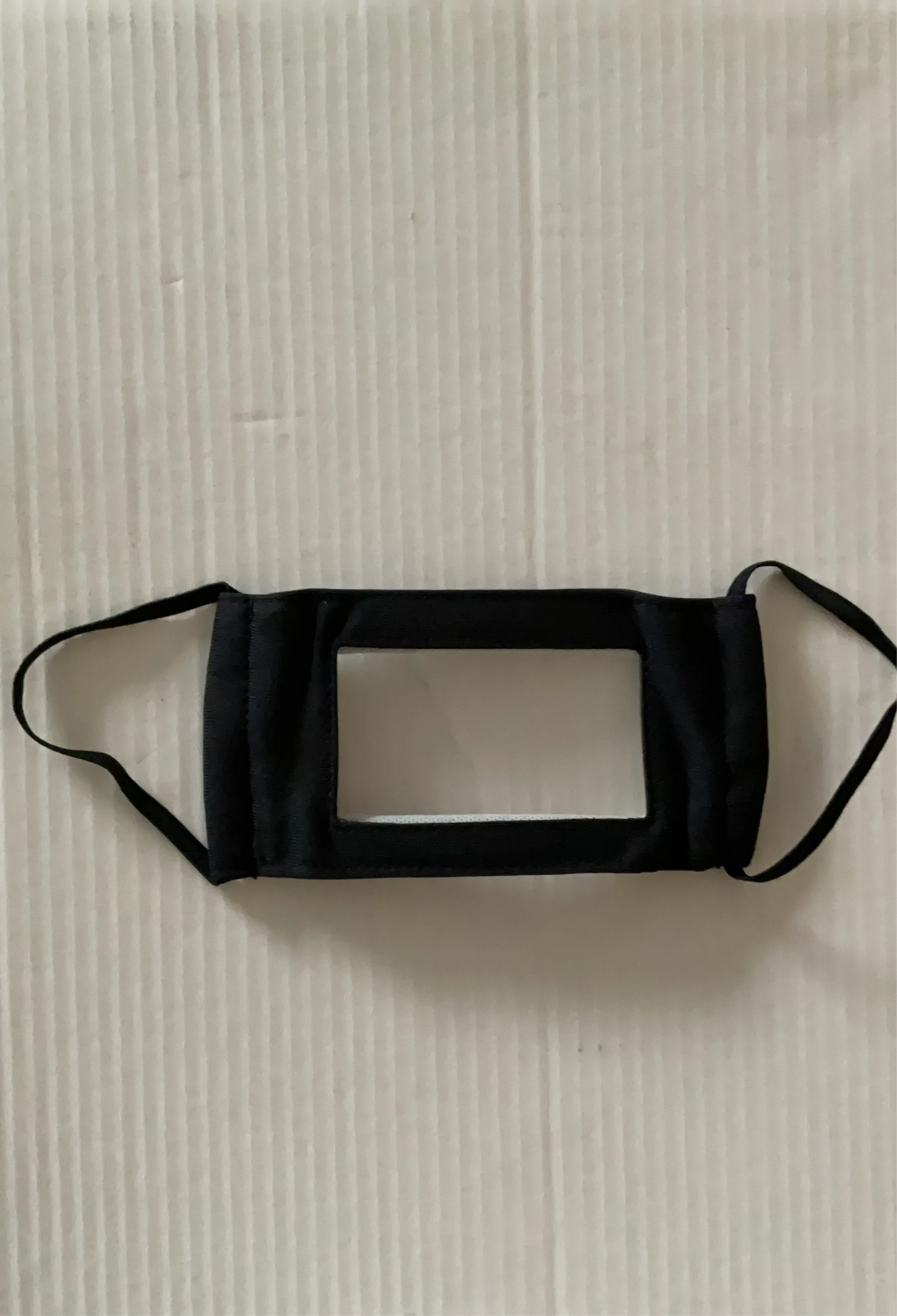 This black cloth face mask features a clear window to allow for lip reading. It's made with a breathable fabric and has elastic ear loops for a comfortable fit. It's packaged for easy transport. This mask is useful for individuals who communicate through lip reading or sign language.