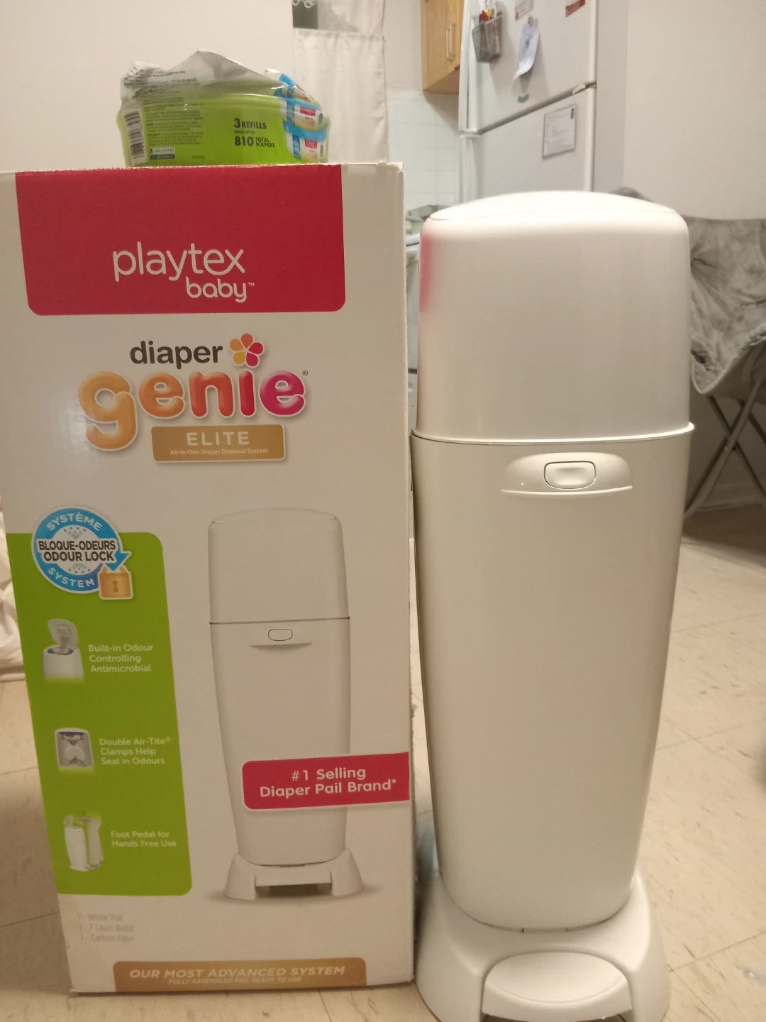 Selling a Playtex Diaper Genie Elite all-in-one diaper disposal system. It features a built-in odour controlling antimicrobial system and double Air-Tite clamps to help seal in odours. It also has a foot pedal for hands-free use! Includes a white pail, one refill and one inside the diaper genie.