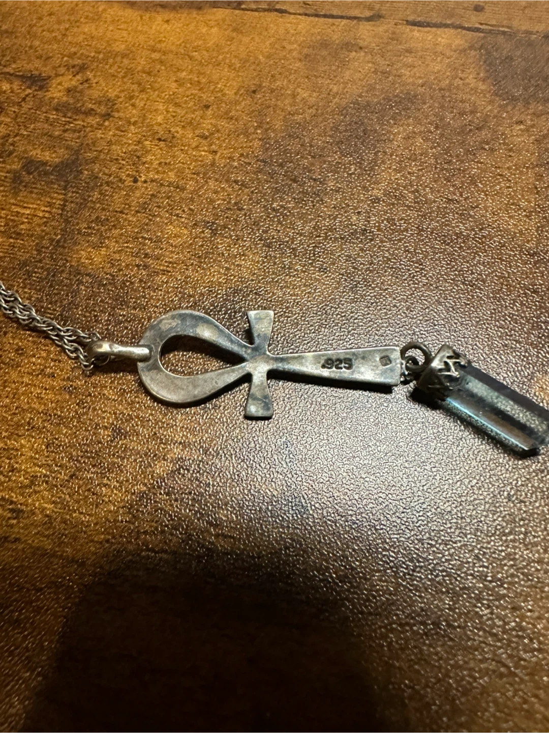 Selling a lovely sterling silver ankh necklace. It features a unique ankh pendant with a crystal accent. The necklace is marked with '925', indicating its sterling silver composition.