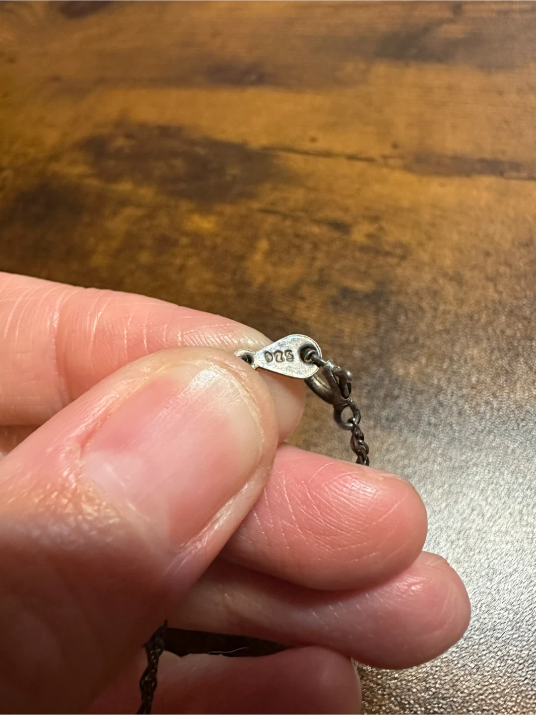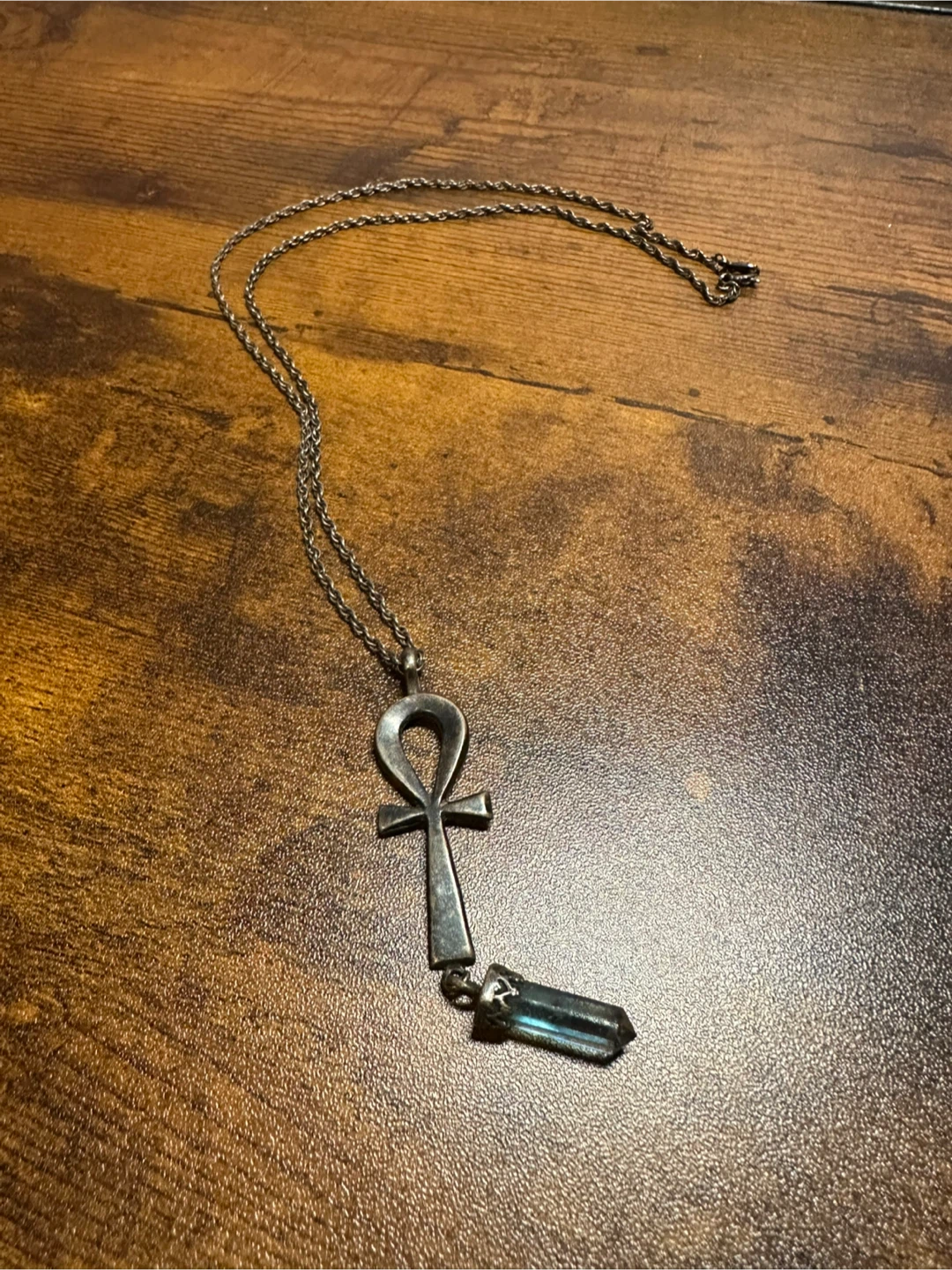 Selling a lovely sterling silver ankh necklace. It features a unique ankh pendant with a crystal accent. The necklace is marked with '925', indicating its sterling silver composition.