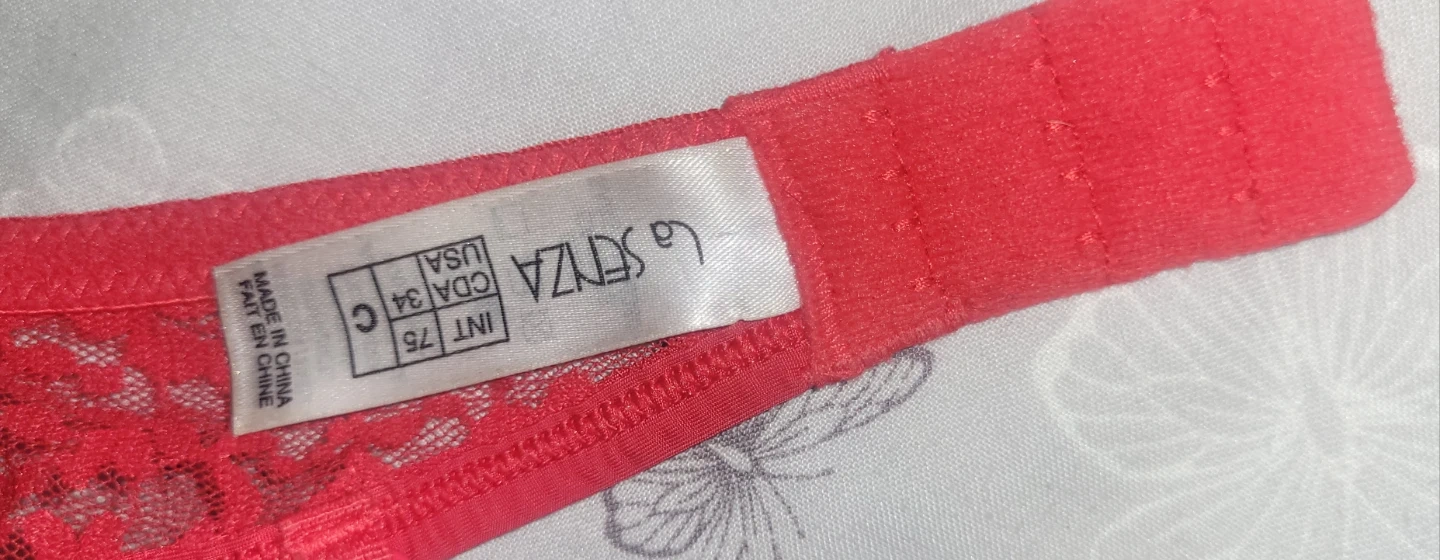 This is a red push-up bra with lace detailing. It's a size 34C, made in China. Features adjustable straps and a hook-and-eye closure.