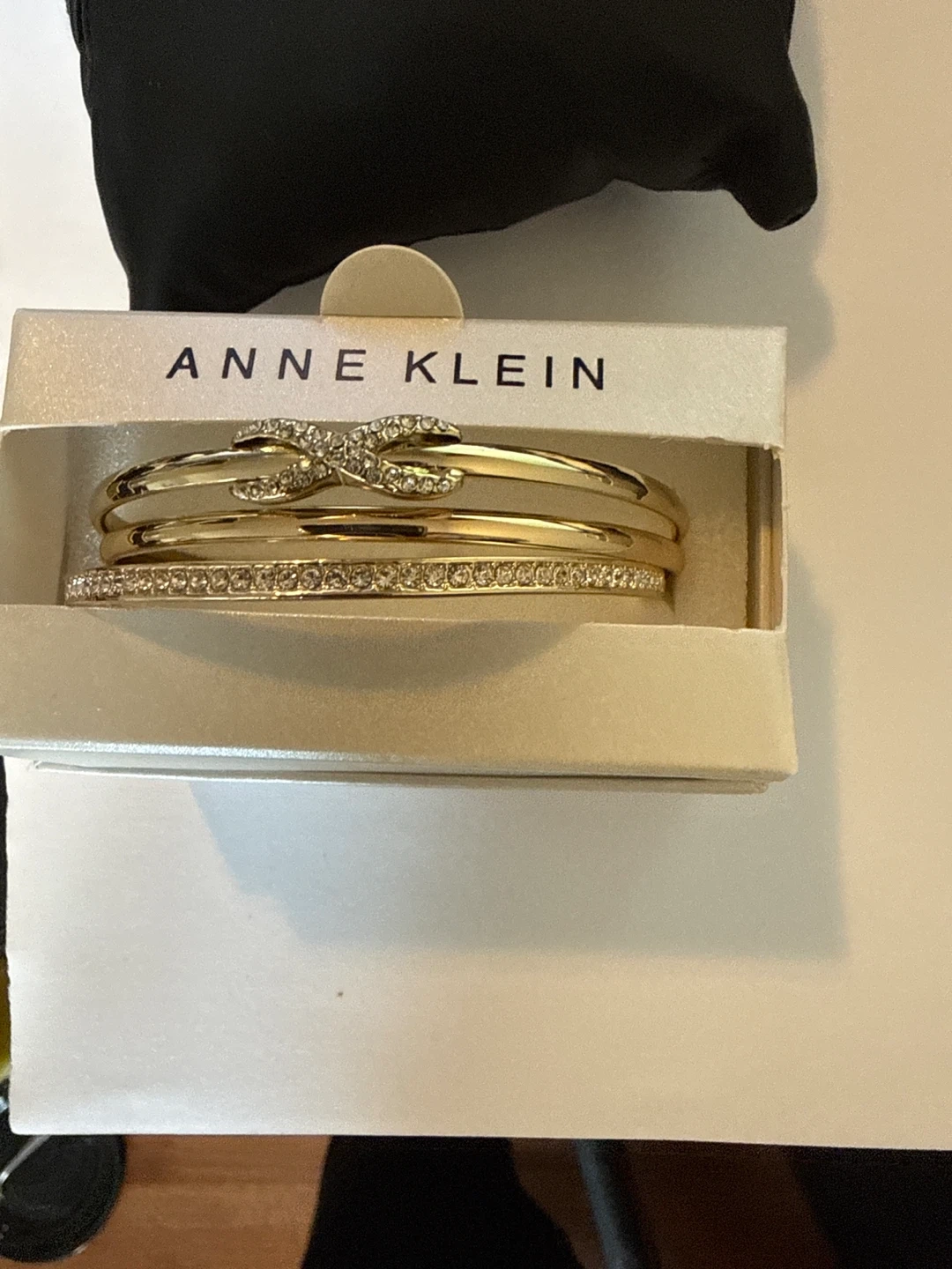 Set of three gold tone bangles from Anne Klein. Features one bangle with a twisted knot design and pave crystal accents, and another with all-over pave crystal accents. Comes in original packaging.