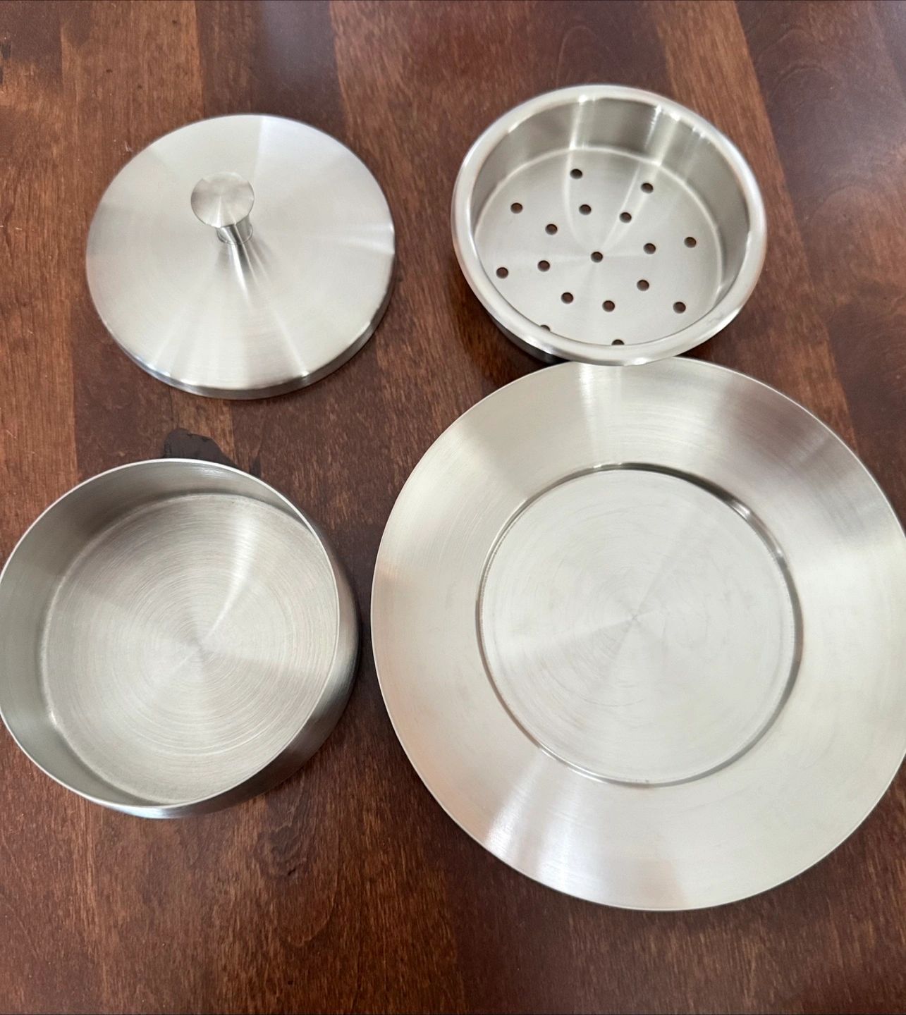 Selling a stainless steel butter dish with a lid! It comes in its original box and includes all the components you see in the pictures. Great for keeping your butter fresh and easily accessible on the table. It's BNIB