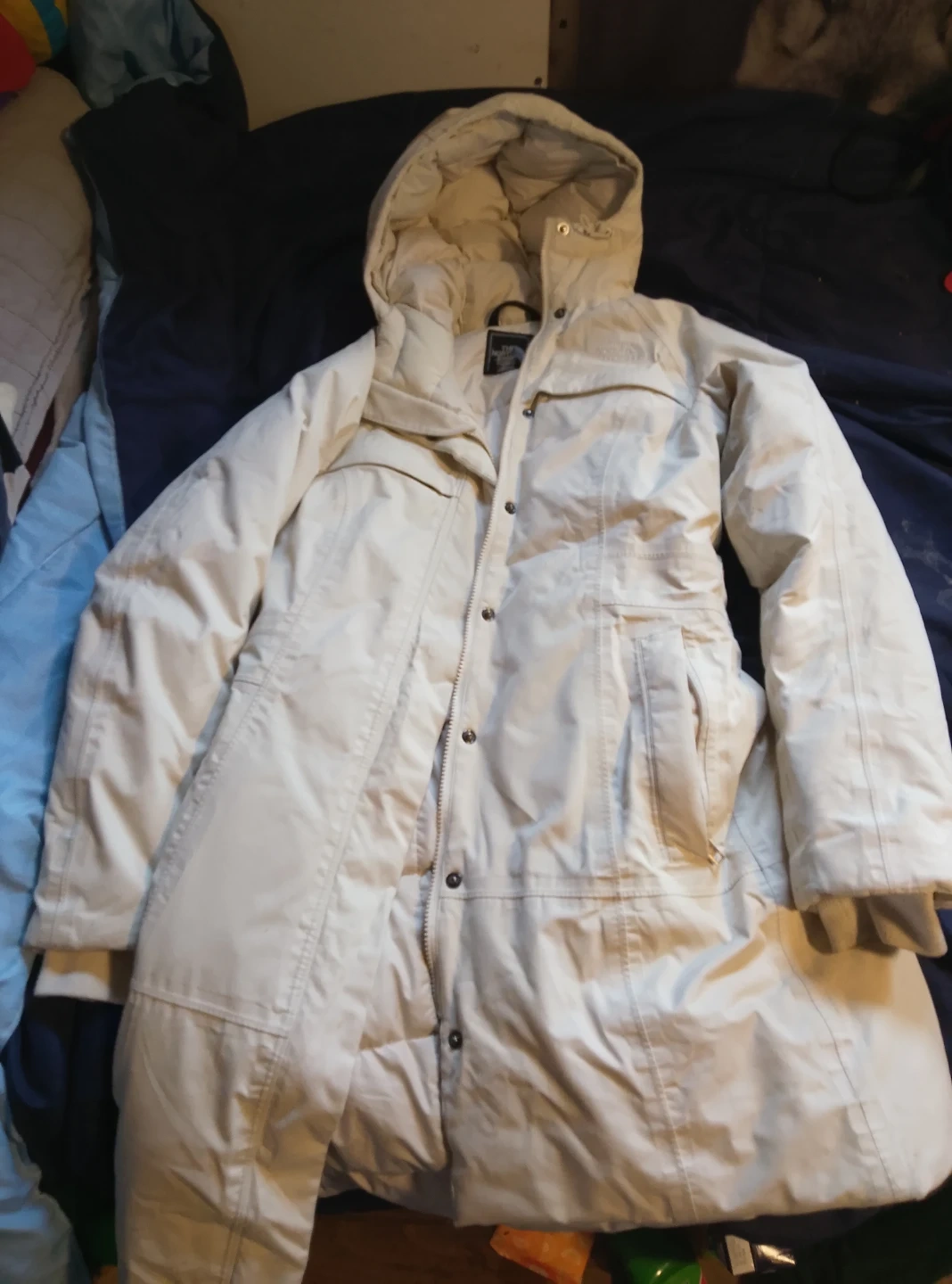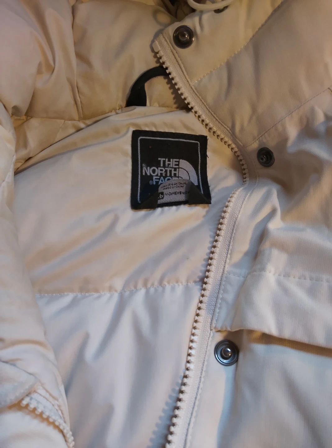 This is a cream insulated parka jacket from The North Face. It features a full zip front with snap closures and a detachable hood. Material is a durable synthetic shell.