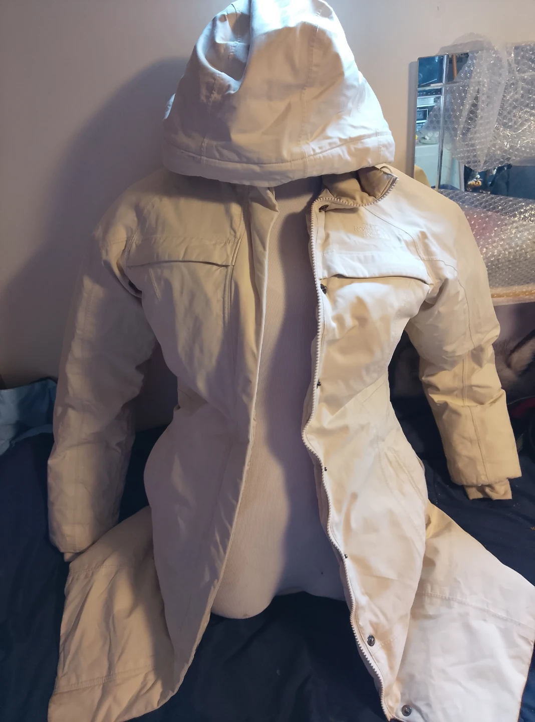 This is a cream insulated parka jacket from The North Face. It features a full zip front with snap closures and a detachable hood. Material is a durable synthetic shell.