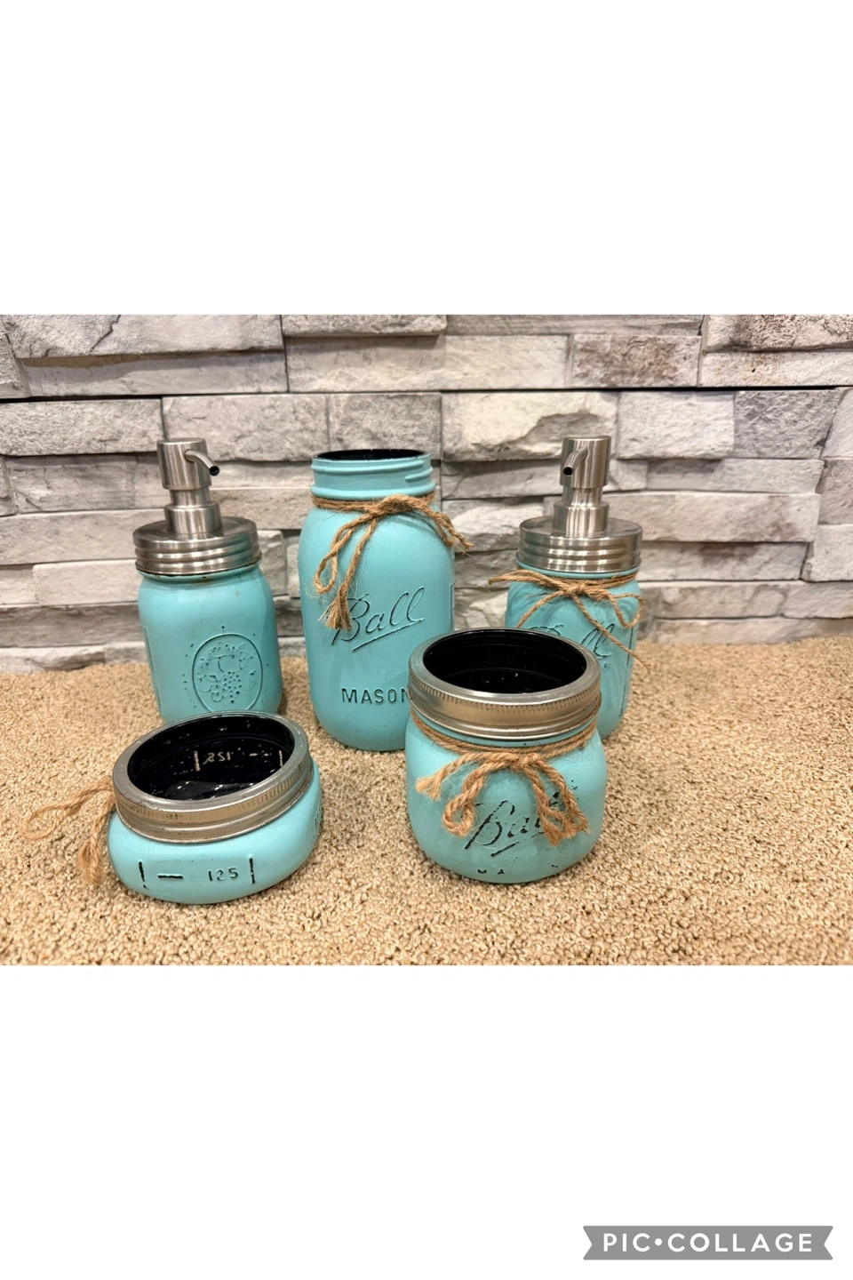 Enhance your bathroom organization and décor with this set of 5 teal mason jars, purchased for a small fortune on Etsy: