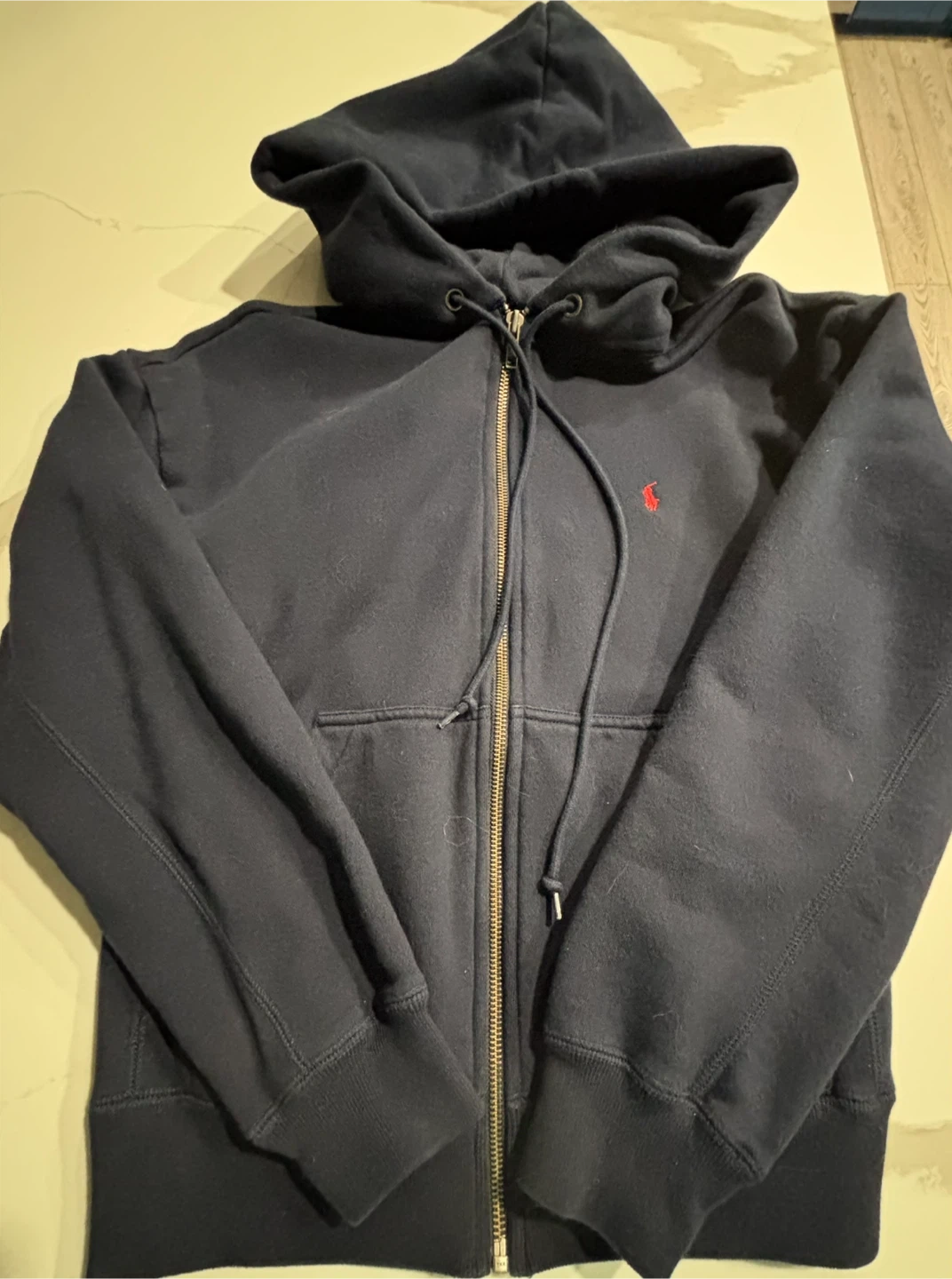 This navy zip-up hoodie is from Ralph Lauren. It's made from 93% cotton and 7% acrylic. Features a small red polo player logo on the chest. Size Small