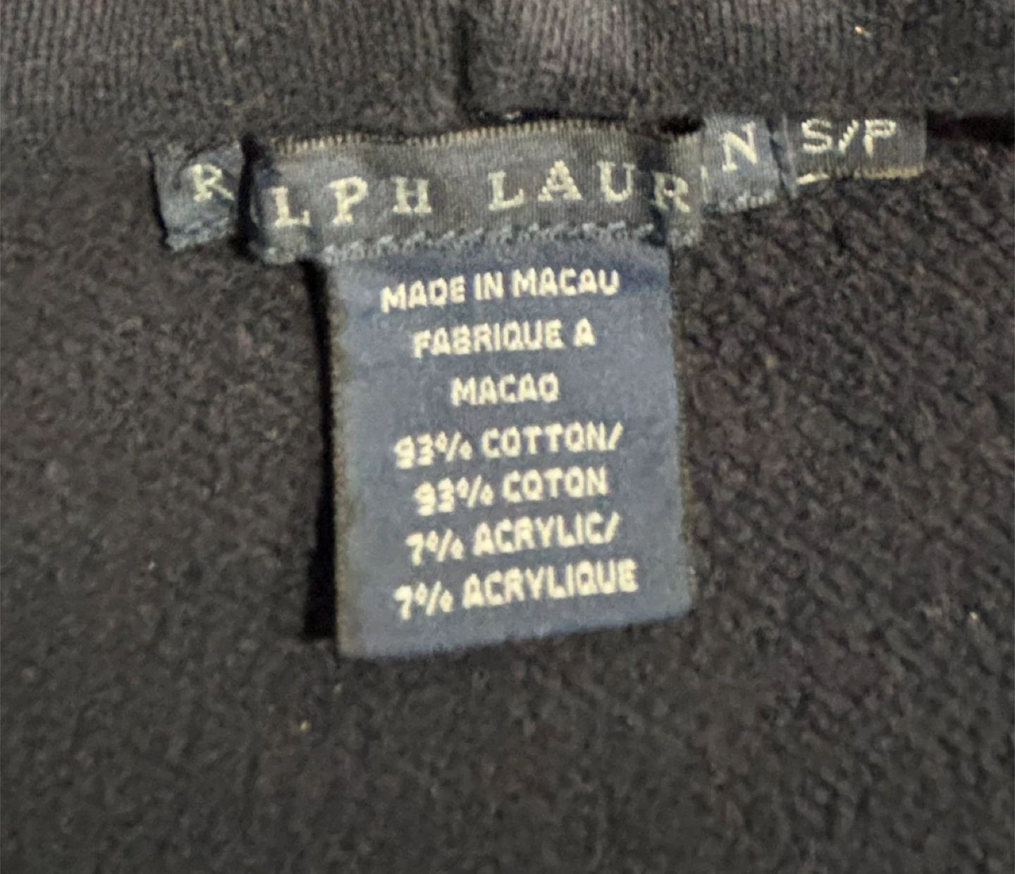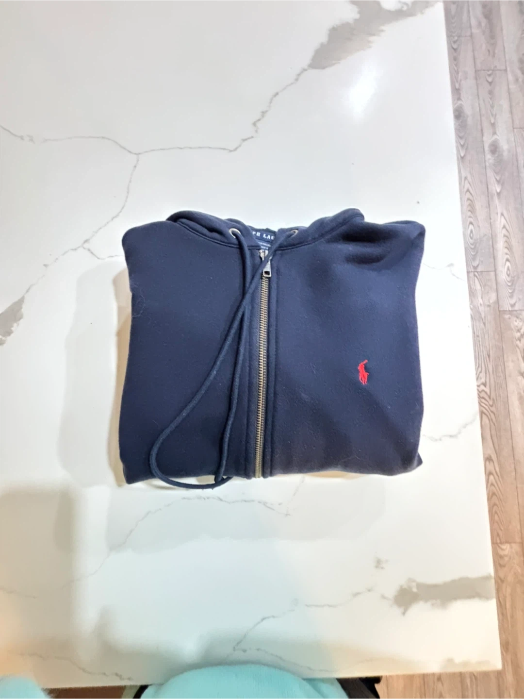 This navy zip-up hoodie is from Ralph Lauren. It's made from 93% cotton and 7% acrylic. Features a small red polo player logo on the chest. Size Small
