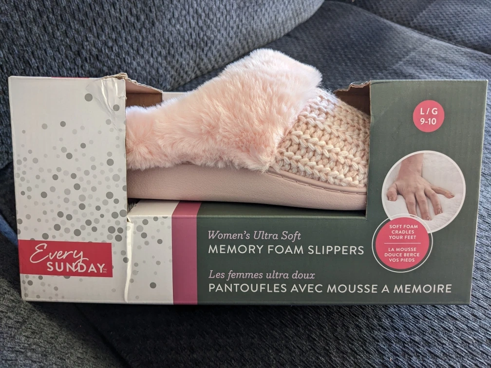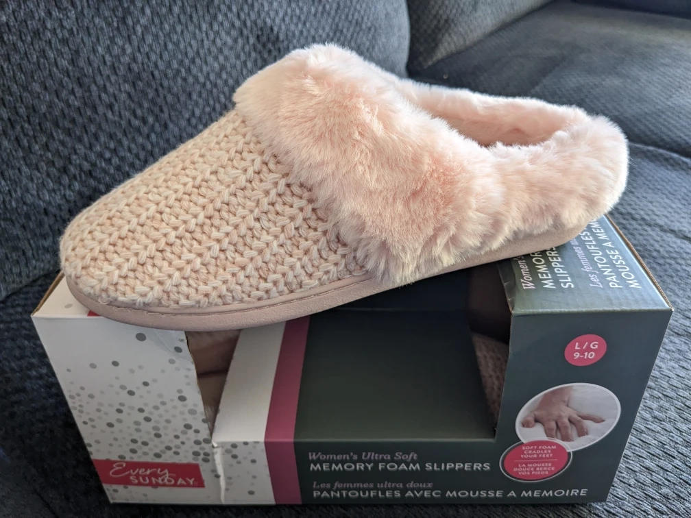 These cozy slippers feature a knitted exterior and soft faux fur trim. They're designed with memory foam for extra comfort. Soft foam cradles your feet!
