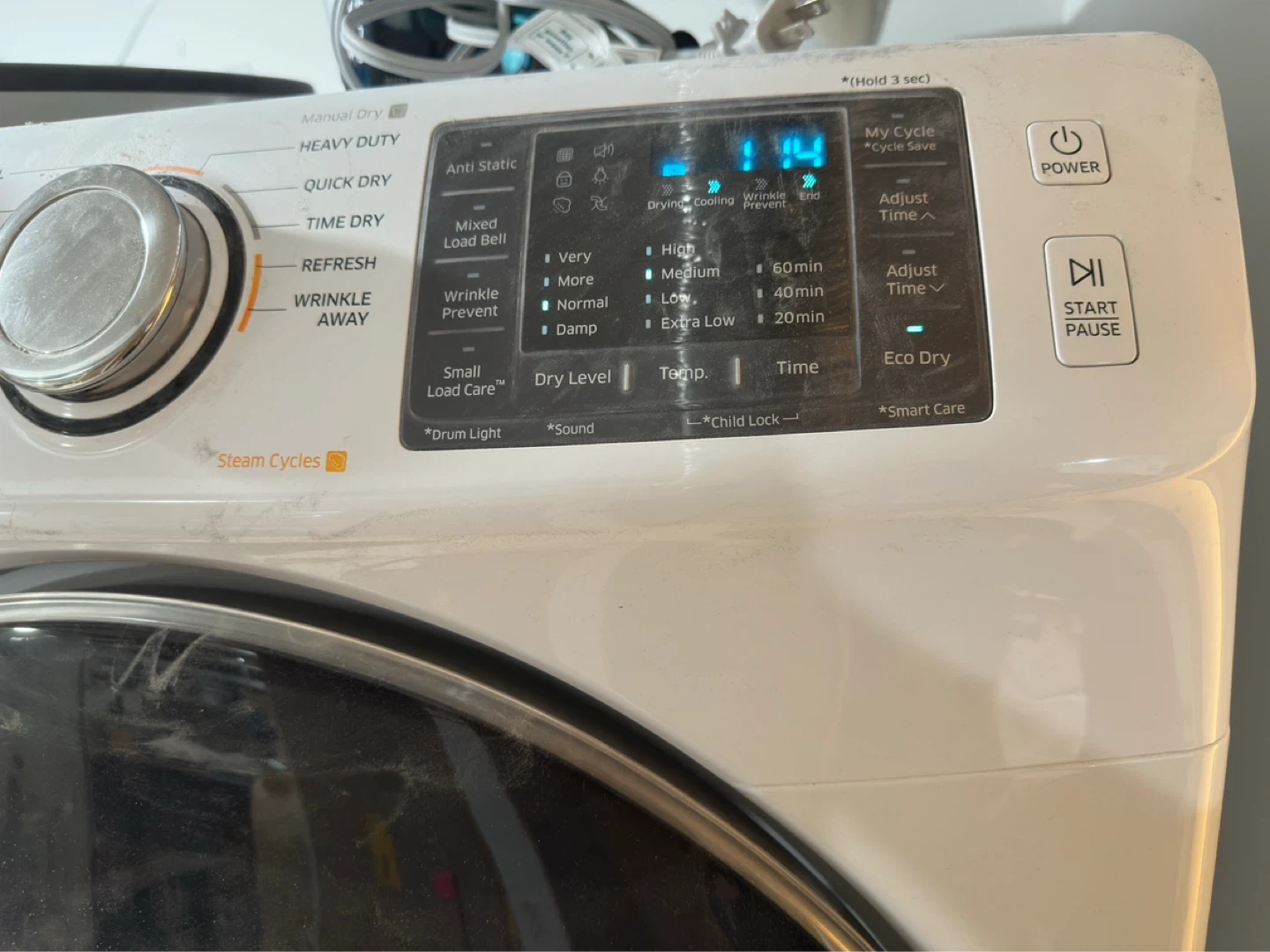 - The dryer cycles include Manual Dry, Heavy Duty, Quick Dry, Mixed Load, Refresh, and Wrinkle Away, with adjustable temperature and time settings.