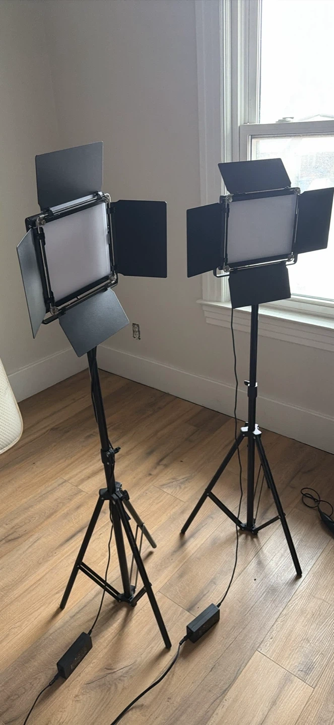 Two Neewer NL660 LED video lights on stands. These lights come with barn doors and carrying bags. They offer adjustable lighting for photography or videography. Great for studio setups!