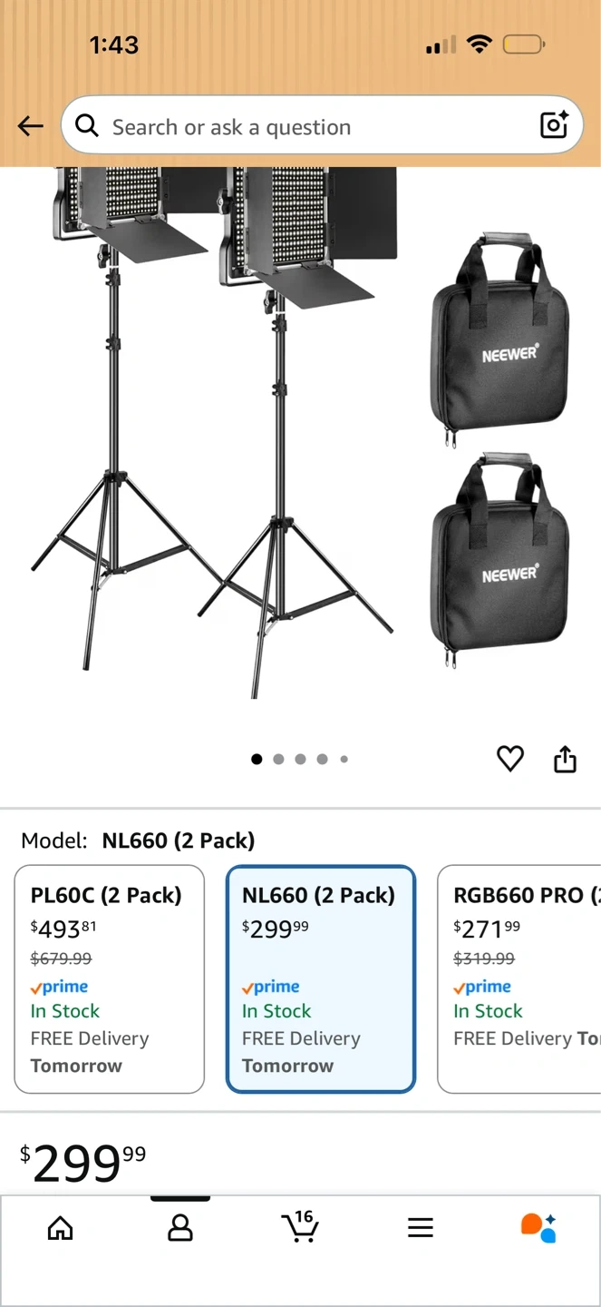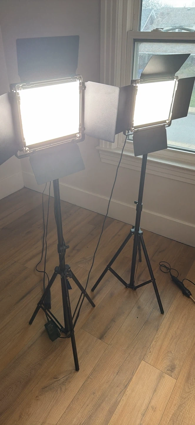 Two Neewer NL660 LED video lights on stands. These lights come with barn doors and carrying bags. They offer adjustable lighting for photography or videography. Great for studio setups!
