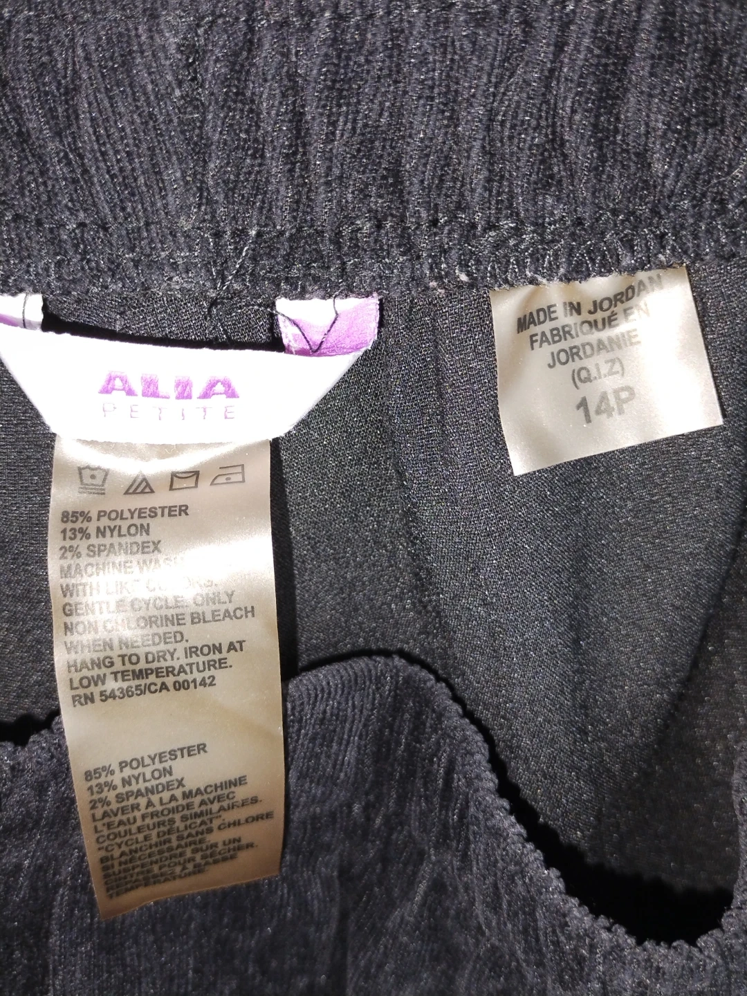 Selling Alia Petite black corduroy pants in size 14P. These pants are made of 85% polyester and 13% nylon with 2% spandex. They feature an elastic waistband for comfort. A great addition to any casual wardrobe!