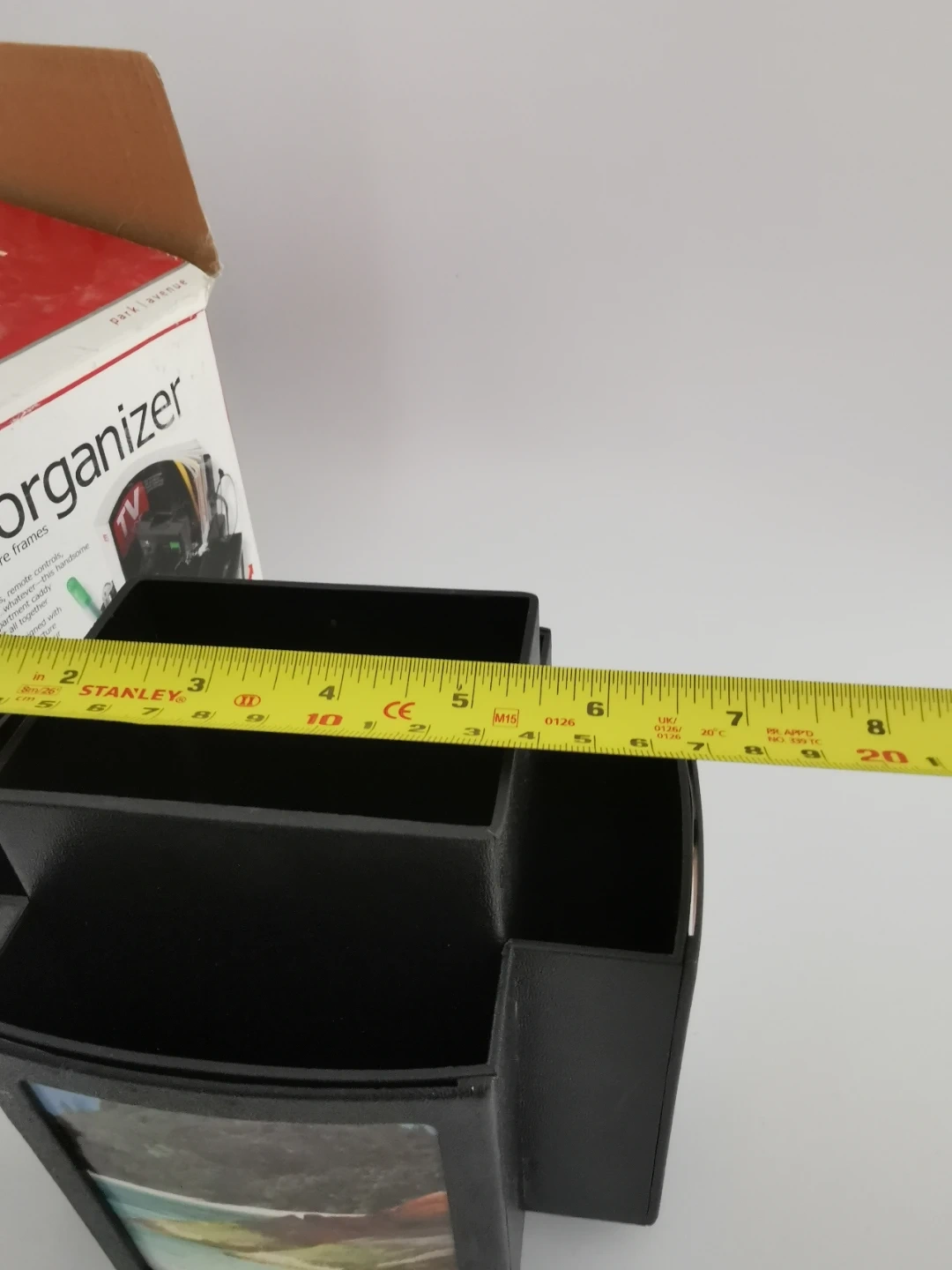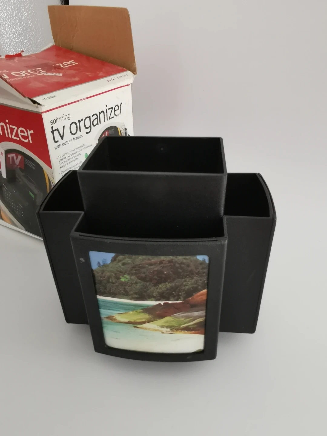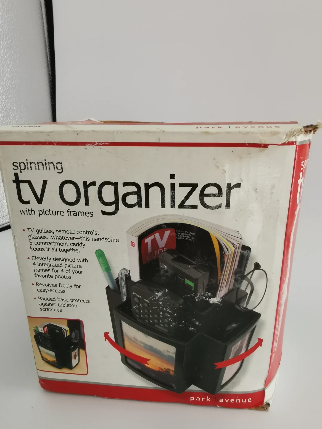A Park Avenue spinning TV organizer with picture frames. It's a 5-compartment caddy designed with 4 integrated picture frames for your favourite photos. The base is padded to protect against tabletop scratches. Comes with the original box!