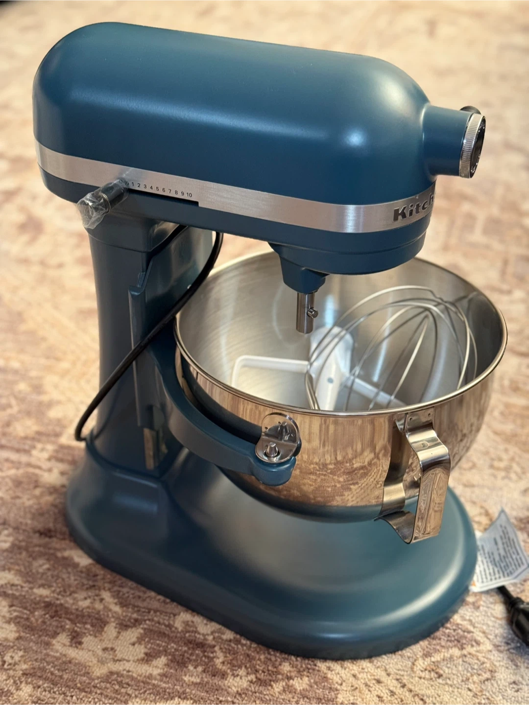 This is a teal KitchenAid stand mixer. It includes a stainless steel bowl, whisk attachment, and flat beater. Mixer has 10 speed settings.