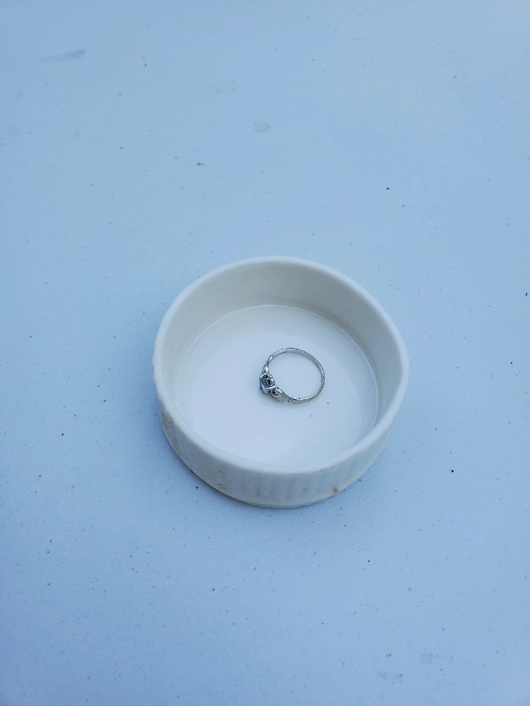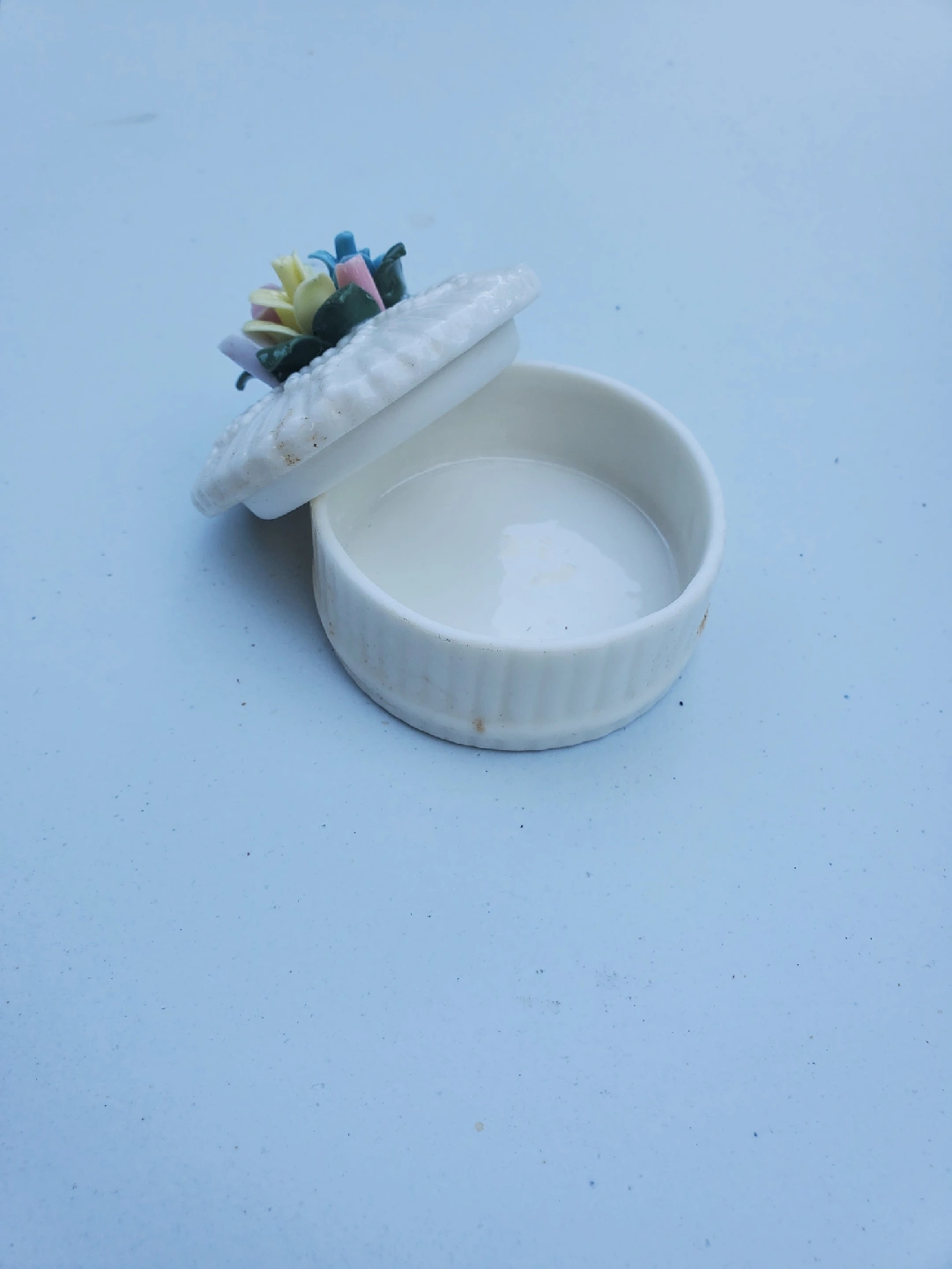 This is a cute little porcelain trinket box! It has a floral design on the lid and is perfect for storing jewelry or other small items. The box is in good condition. size 7 ring to show size.