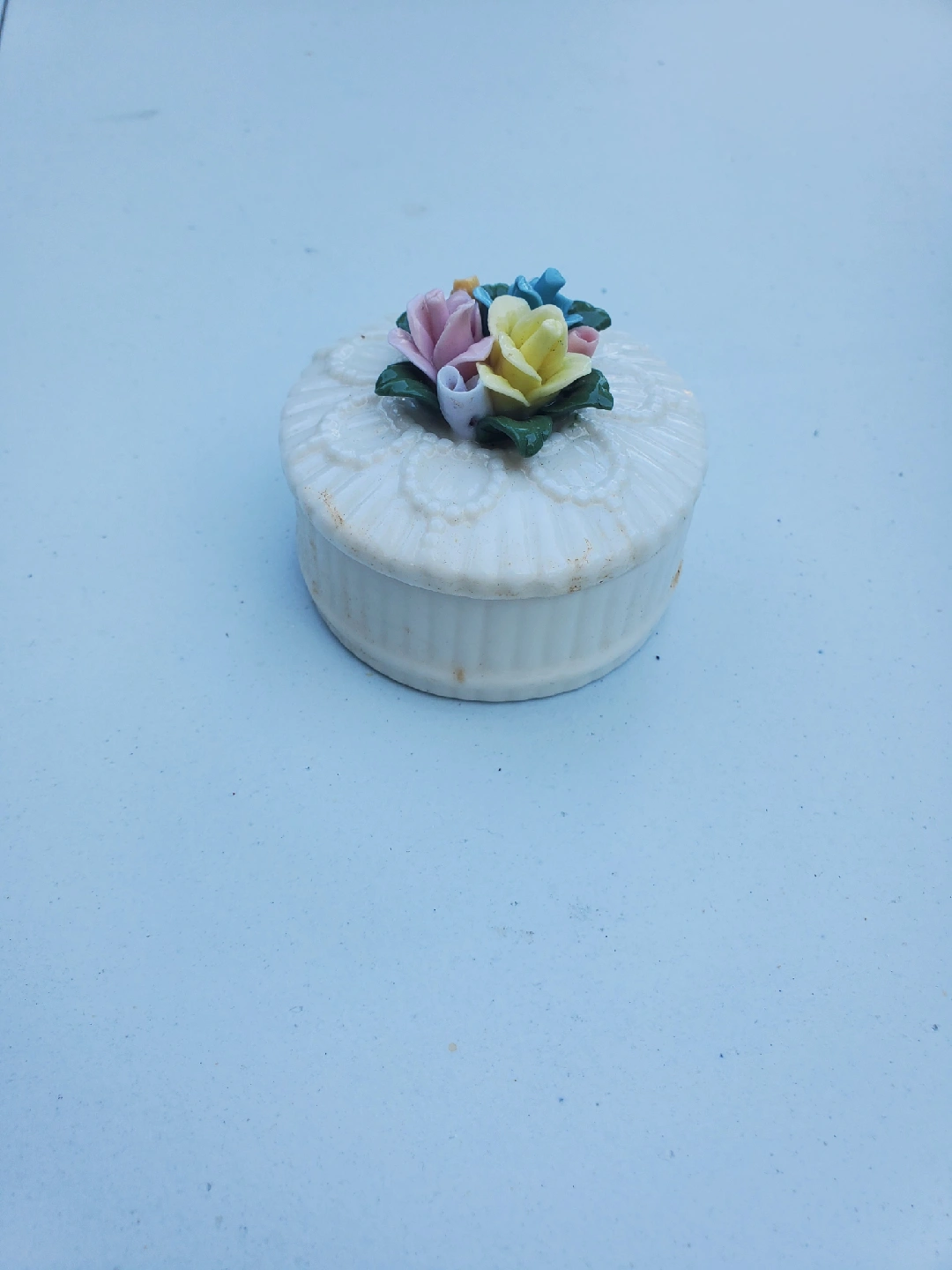 This is a cute little porcelain trinket box! It has a floral design on the lid and is perfect for storing jewelry or other small items. The box is in good condition. size 7 ring to show size.