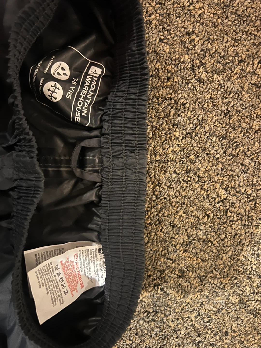 Mountain Warehouse waterproof pants for kids, size 7-8 years. These black rain pants are designed for outdoor play in wet weather. They feature an elastic waistband for a comfy fit.