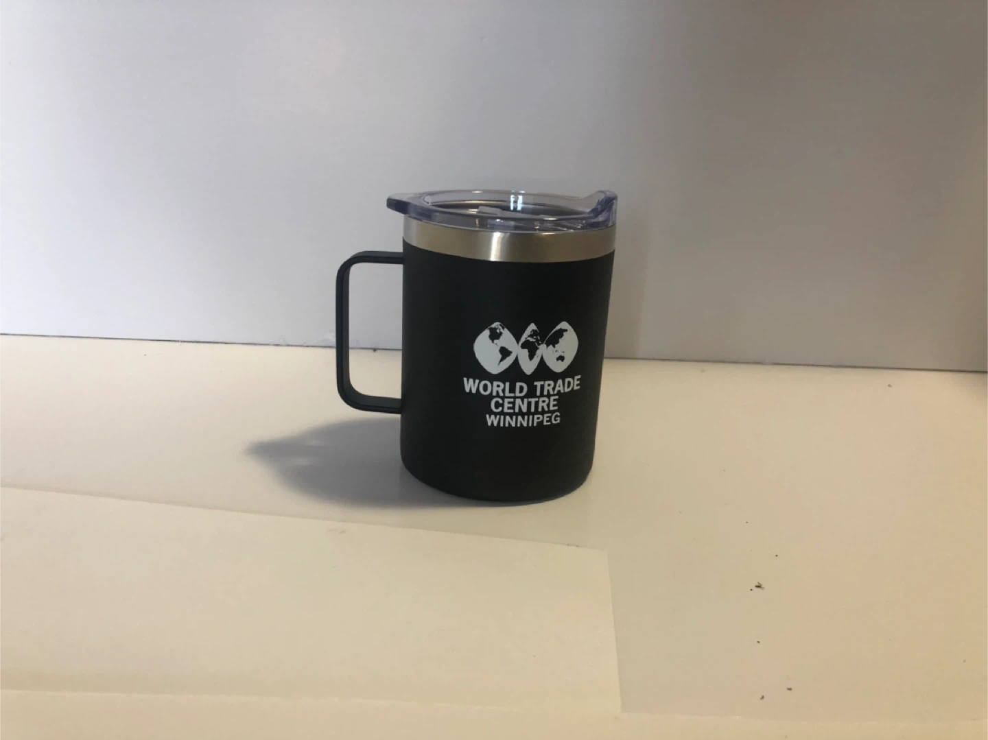 Black insulated travel mug with a handle. It has a secure-fitting lid. Keeps drinks hot or cold for hours. Perfect for your commute or office desk!